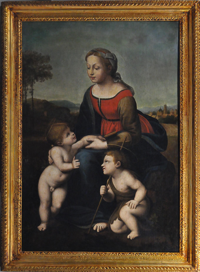 Anonimo ( fine XVIII - Inizi XIX sec) Da Raffaello - Madonna con bambino e San Giovannino olio su tela, cm 115x78