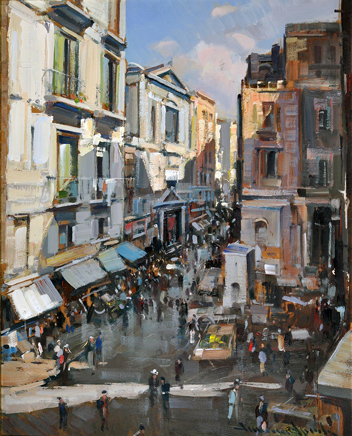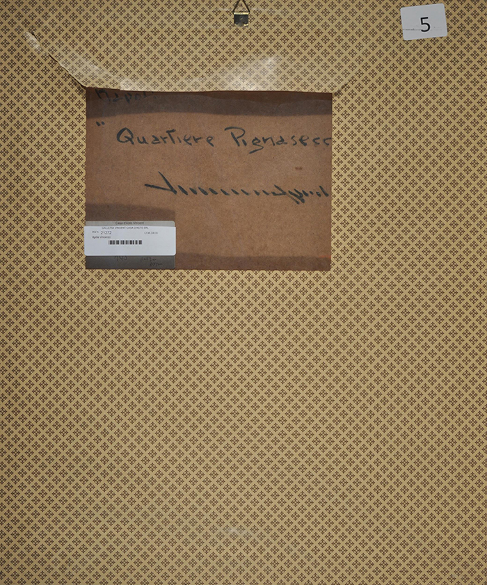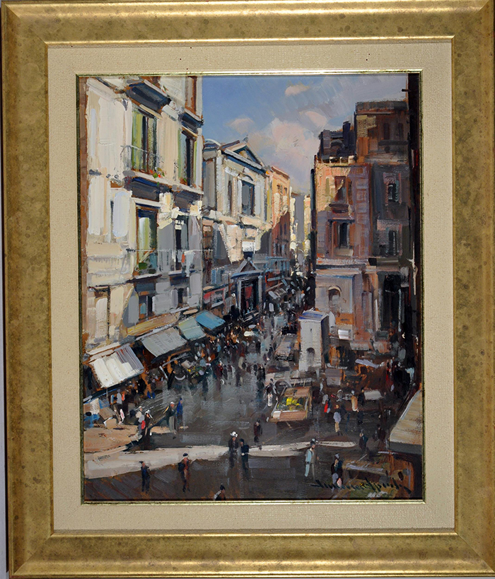 Aprile Vincenzo (Napoli 1952) Quartiere Pignasecca olio su tavola, cm 50x40 firmato in basso a destra: Vincenzo Aprile a tergo firmato e iscritto: Vincenzo Aprile Quartiere Pignasecca