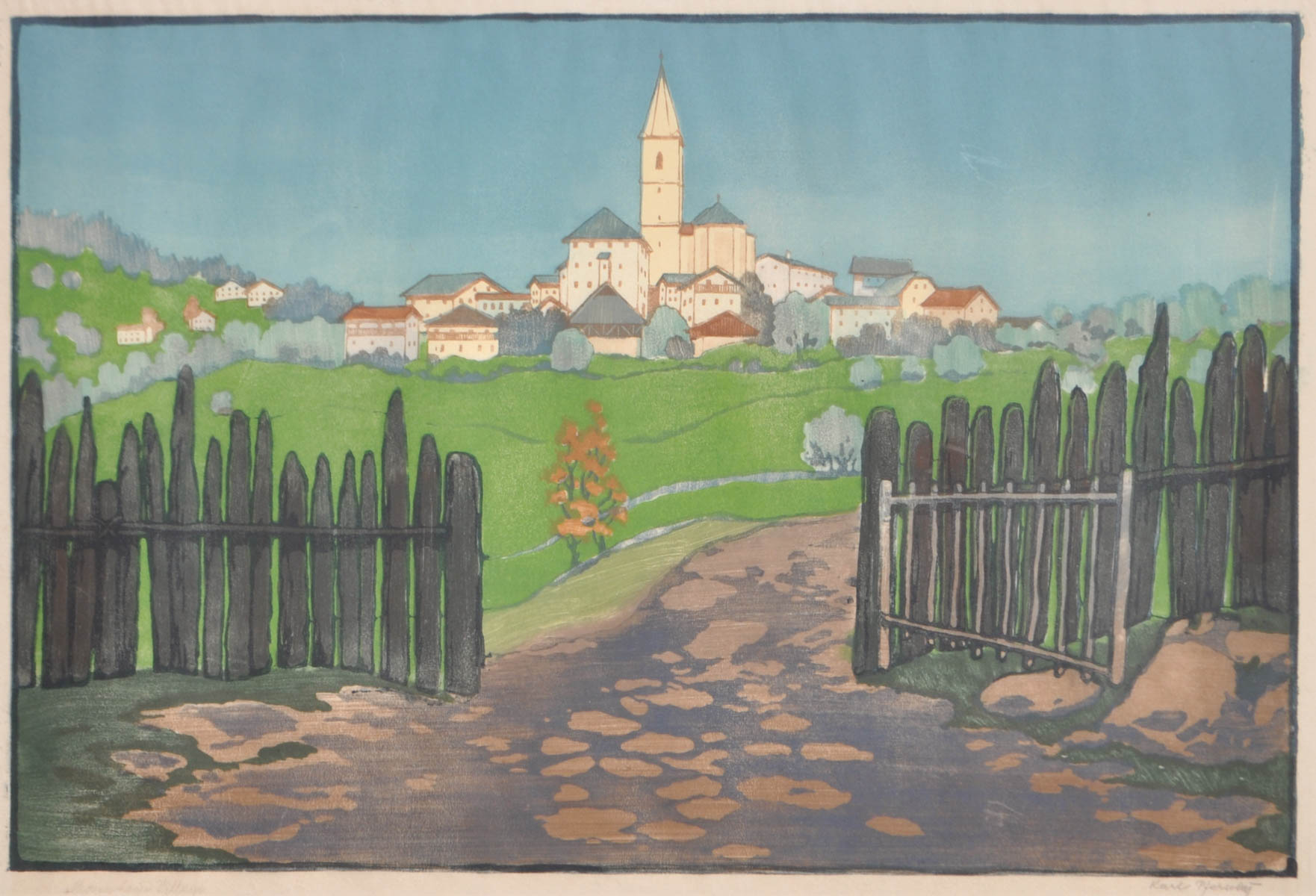 Karl Pferschy (Deutschlandsberg 1888 - Bozen/Bolzano 1930) Villaggio di montagna (San Genesio);Xilografia a colori, 32,5 x 48,5 cm, in cornice