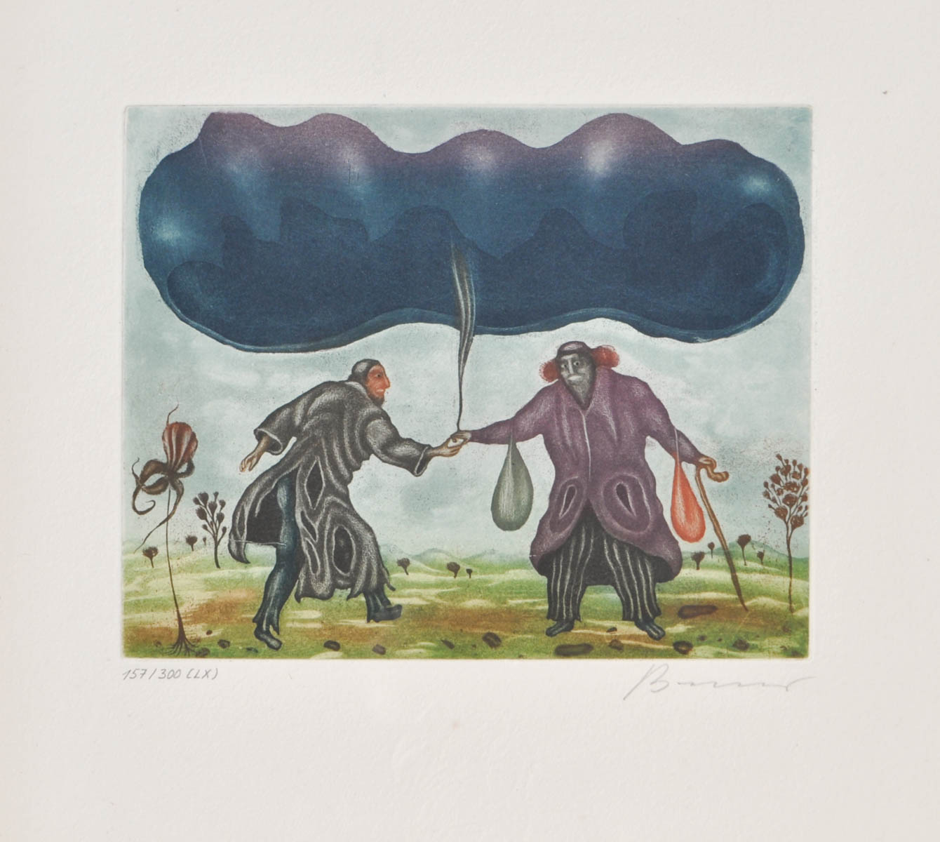 Arik Brauer (Wien/Vienna 1929 - 2021) Su due gradini, 1973;Acquatinta, 20,5 x 24,5 cm (lastra), 36 x 39,5 cm
