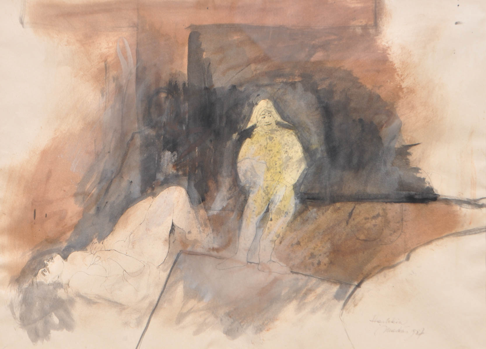 Markus Vallazza St. Ulrich in Gröden/Ortisei 1936 - Bozen/Bolzano 2019) Arlecchino, 1987;Tecnica mista su carta, 48 x 67 cm, in cornice