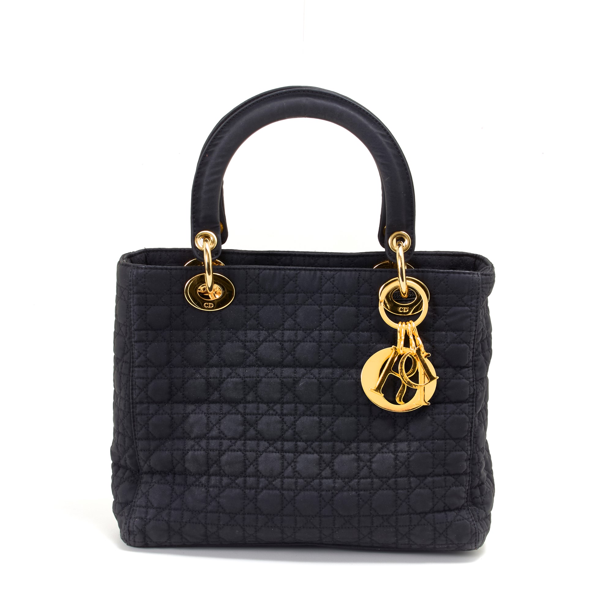 Borsa a mano Lady Dior Cannage vintage, misura media, in nylon trapuntato, metalleria dorata e rivestimento interno in nylon rosso. Buone condizioni.