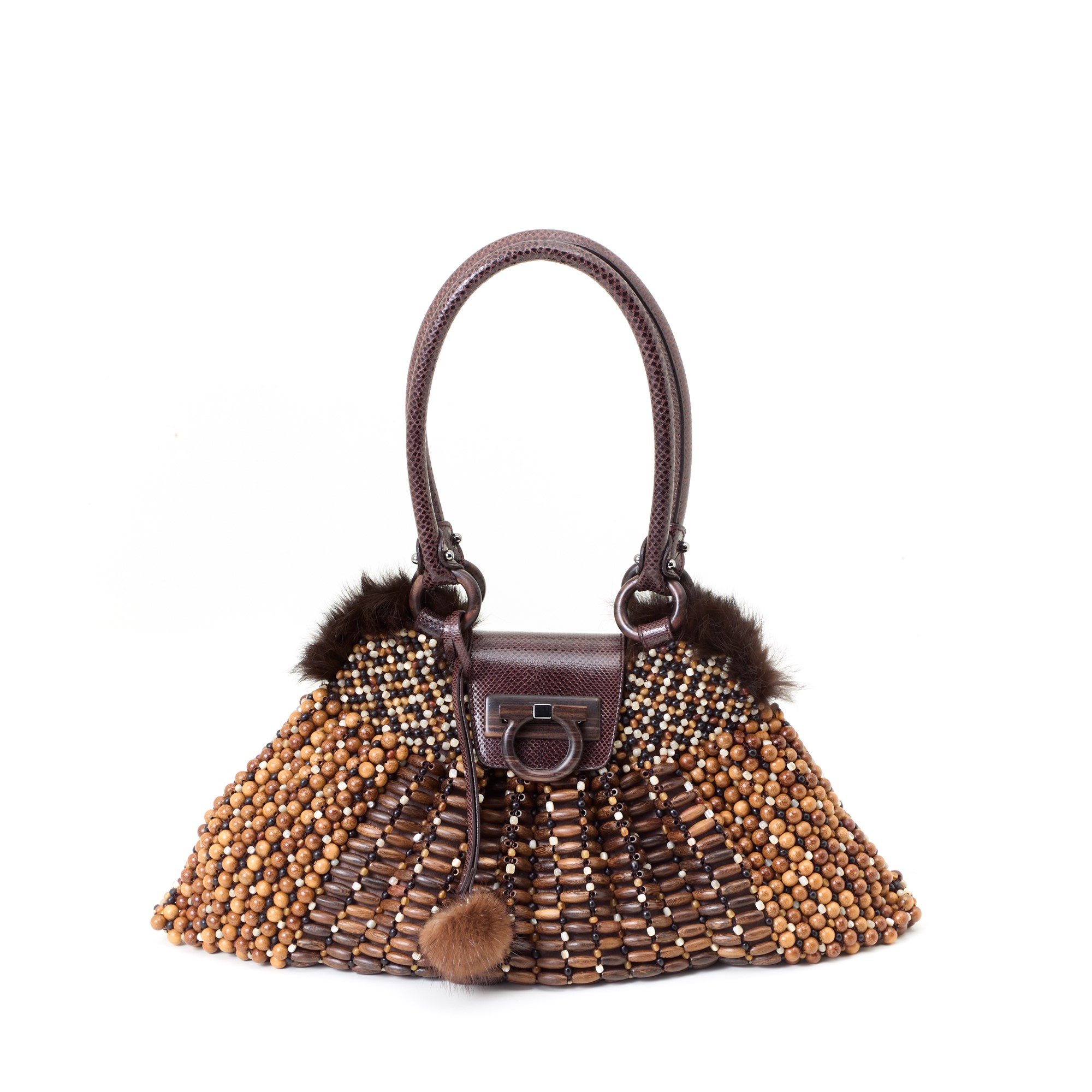 Salvatore Ferragamo Limited Edition handbag with mink inside, brown python details and alternating booles in the wooden shapes. Python front buckle closure. Original dustbag included. Very good conditions.