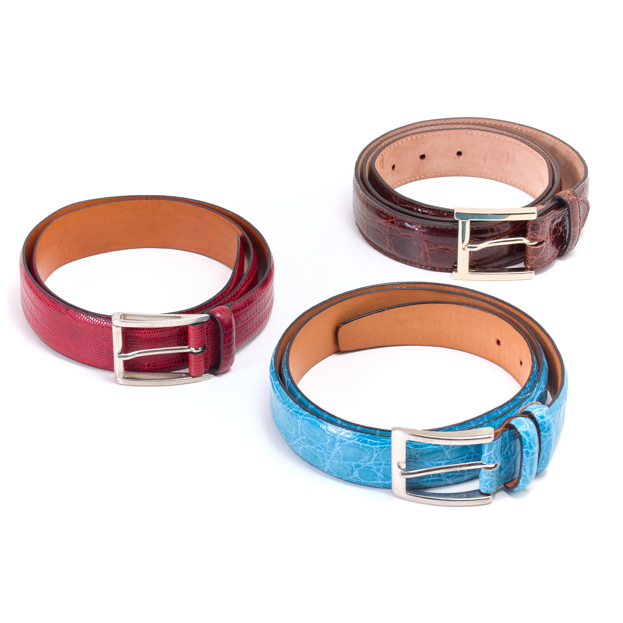 Lotto composto da due cinture in coccodrillo e da una in pelle stampa lucertola. Ottime condizioni.