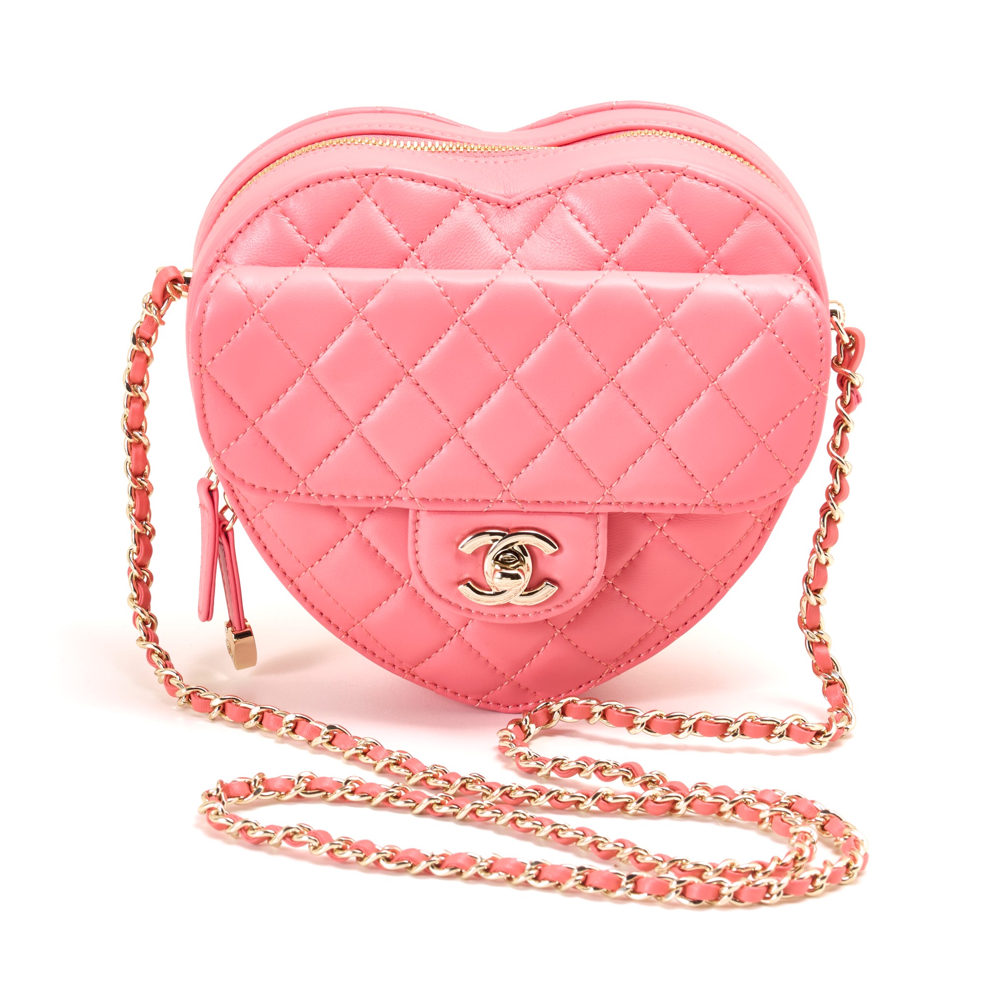 Chanel CC In Love heart bag in peach pink matelassè leather with golden metal hardware, 2022 collection. Original dustbag included. Like new.