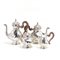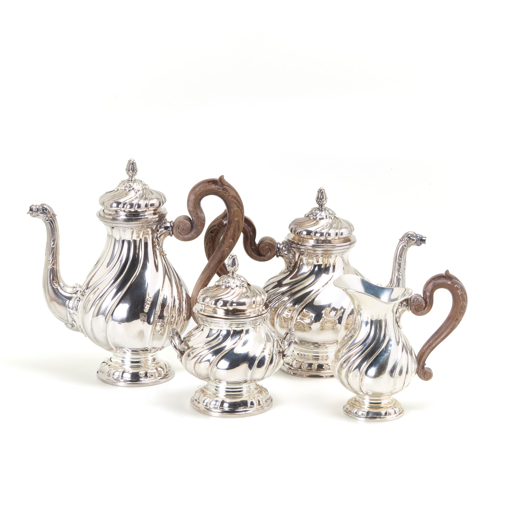 Silver tea and coffee set with wooden handles, consisting of: teapot, coffee pot, milk jug and sugar bowl.