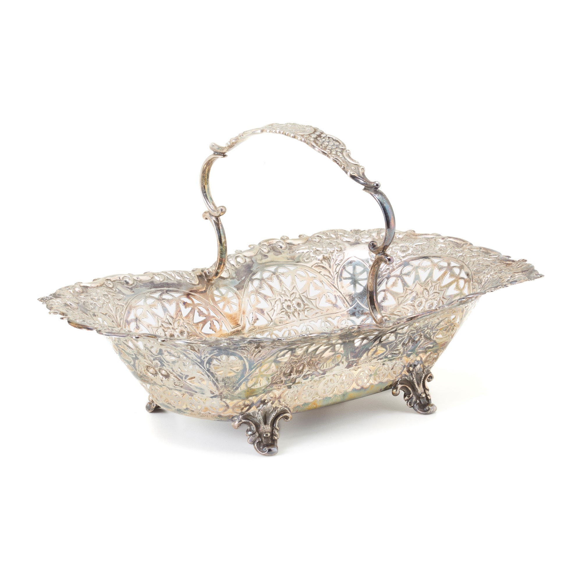 Cestino in argento di forma ovale traforato e sbalzato a motivi floreali, cavetto inciso con iniziali. Manico decorato a volute e motivi vegetali. Punzoni Londra 1911.