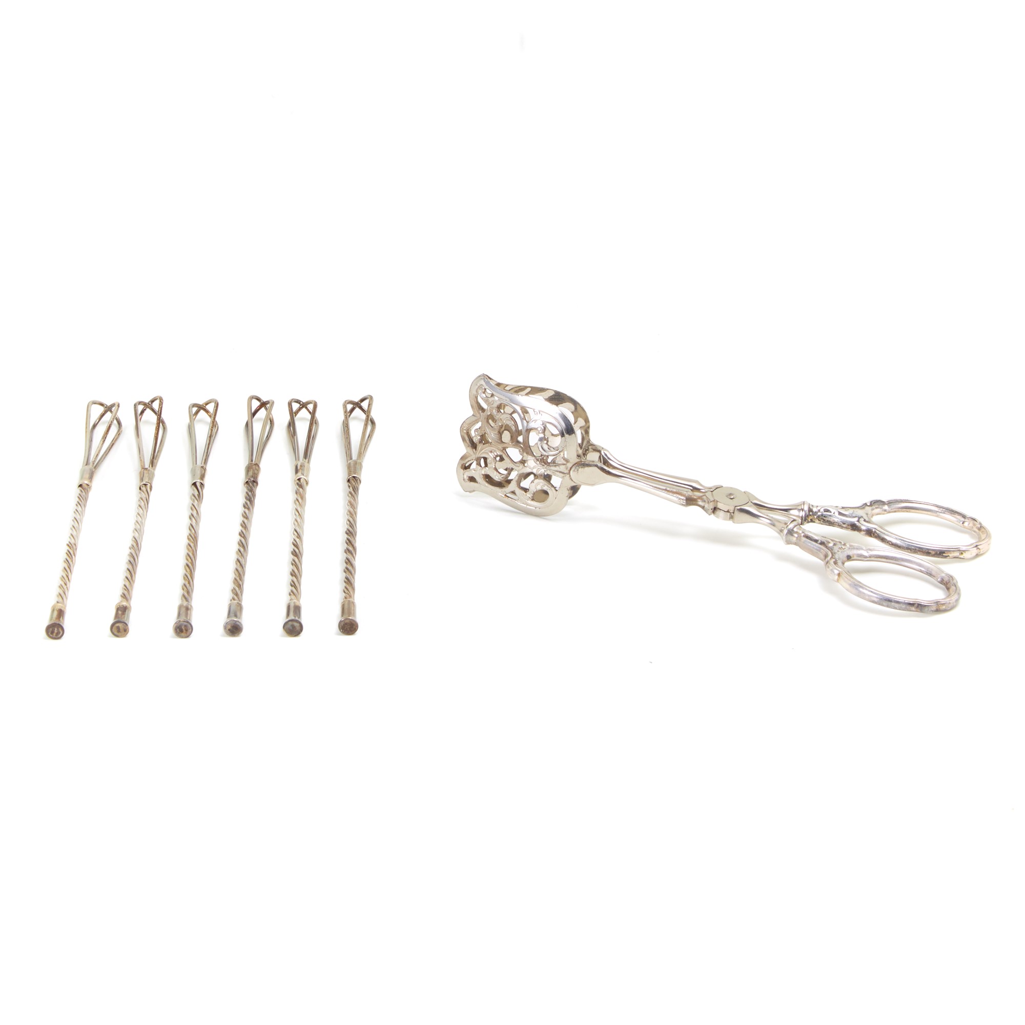 Silver lot consisting of dessert tongs and a set of six cocktail spoons in Chiappe box.