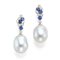 Orecchini in oro bianco 18 Kt con perla bianca coltivata di circa 14x19 mm, rifiniti con diamanti rotondi per complessivi 0,50 ct e zaffiri rotondi mezza rosetta per complessivi 1,26 ct.