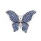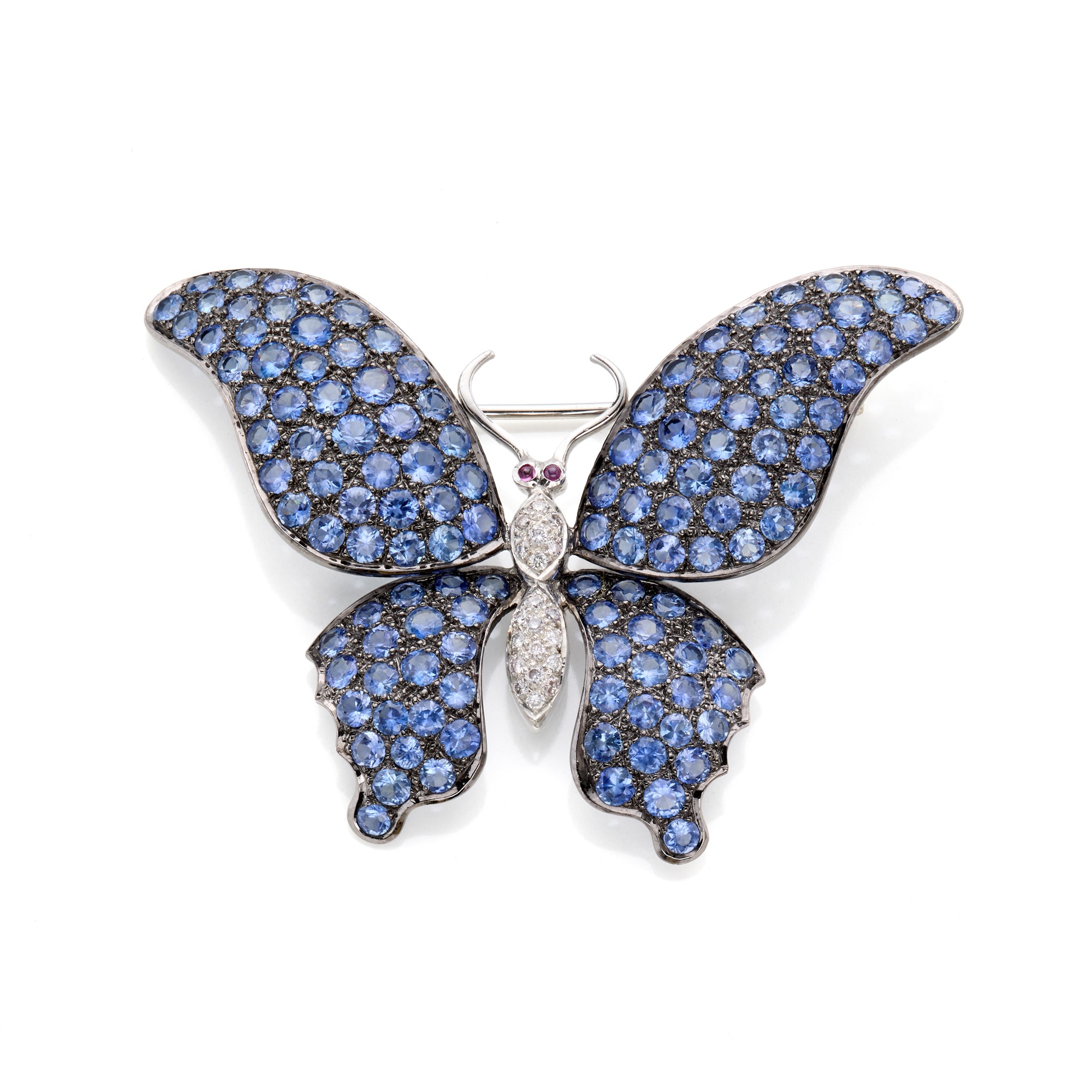 Butterfly brooch in 18 Kt white and black rhodium-plated gold, set with round sapphires totalling approx. 5,50 ct, pavè set round diamonds and two cabochon rubies.
