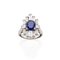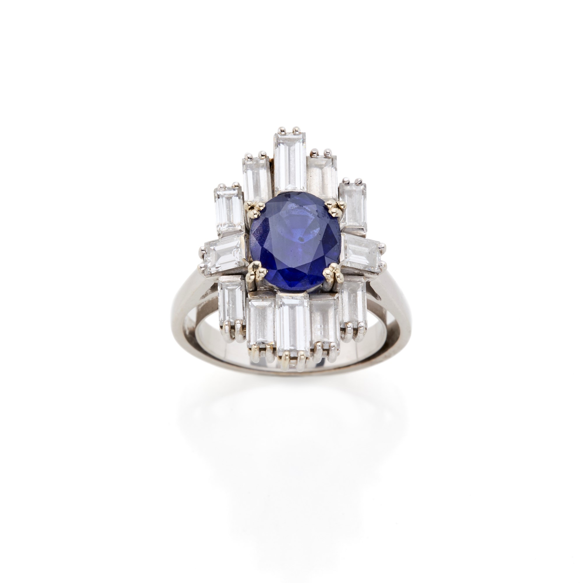 Anello in oro bianco 18 Kt con zaffiro ovale di circa 2,30 ct, contornato da diamanti baguette per complessivi circa 1,80 ct.