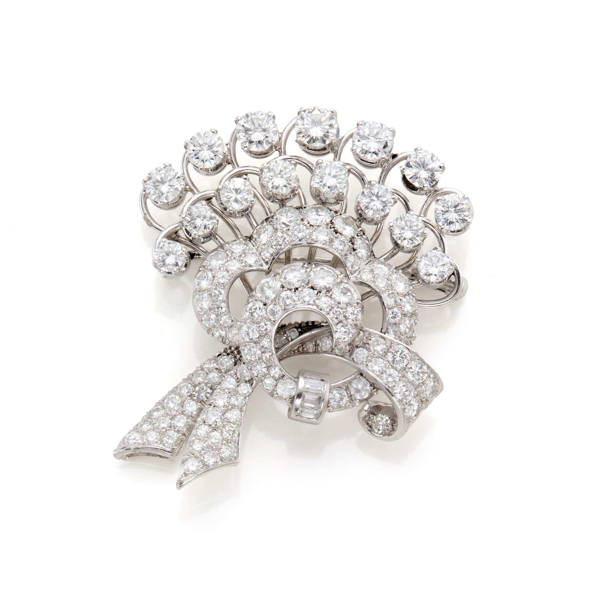 Spilla in oro bianco 18 Kt rifinita con diamanti rotondi per complessivi circa 4,50 ct.