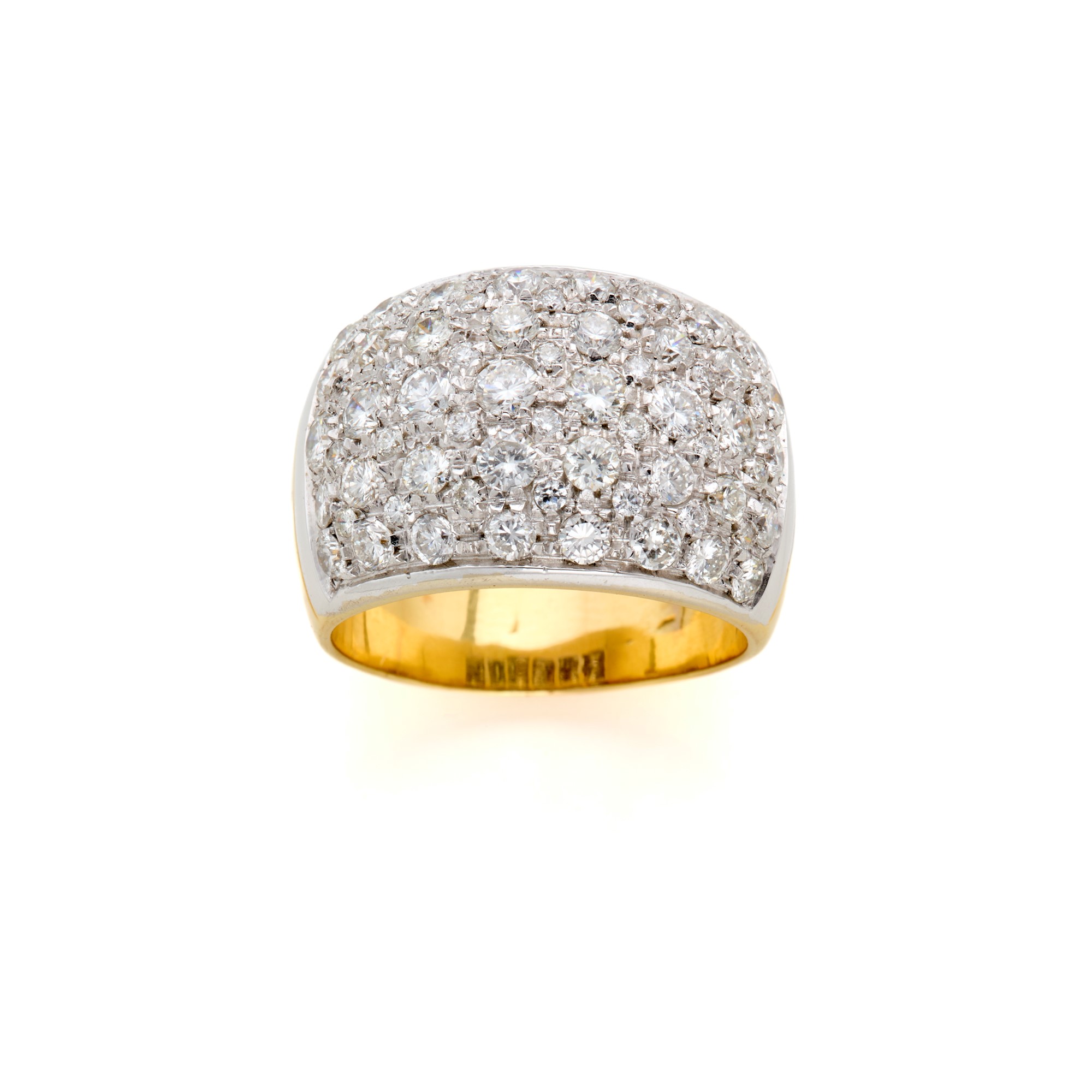 Anello a fascia in oro giallo e bianco 18 Kt rifinito con diamanti rotondi per complessivi circa 3,50 ct.