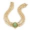 Choker in oro giallo 18 Kt a tre fili di perle coltivate bianche di circa 7 mm, al centro un cabochon intagliato a motivo floreale.