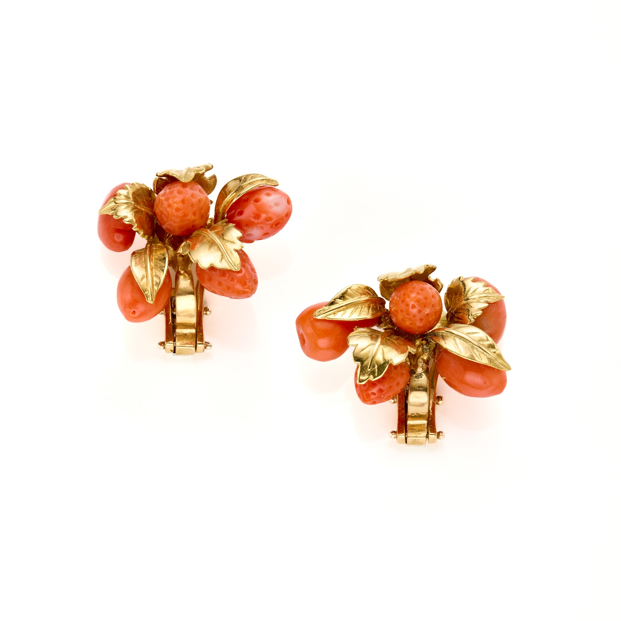 Micheletto earrings in 18 Kt yellow gold decorated with orange corals. (dfetti)