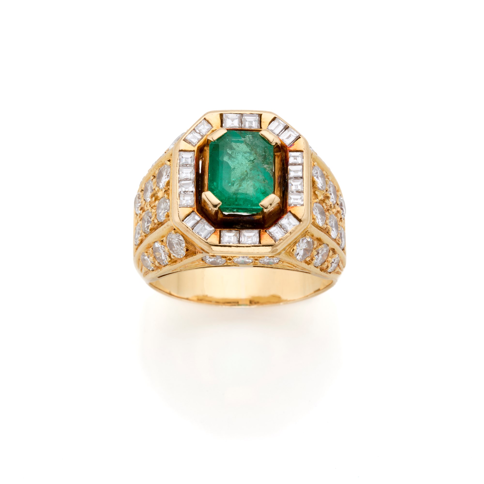18 Kt yellow gold ring with an octagonal emerald weighing approx. 1,90 ct flanked by round and carrè diamonds totalling approx. 1,80 ct.