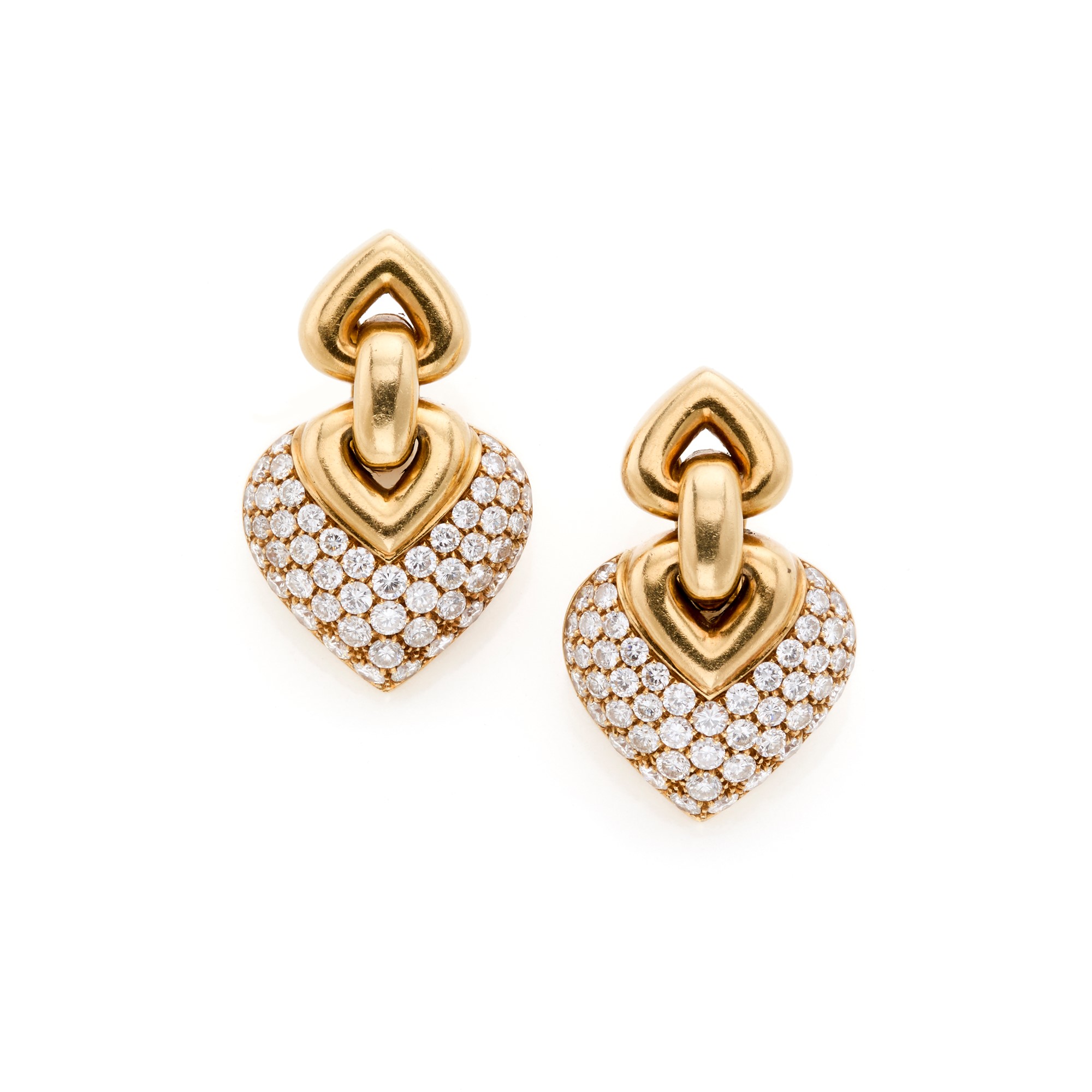 Orecchini Bulgari, collezione Doppio Cuore, in oro giallo 18 Kt decorati con diamanti rotondi per complessivi circa 2,80 ct.