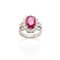Anello in platino con rubino ovale del peso di circa 4,50 ct contornato da diamanti rotondi e baguette per complessivi circa 2,55 ct.
