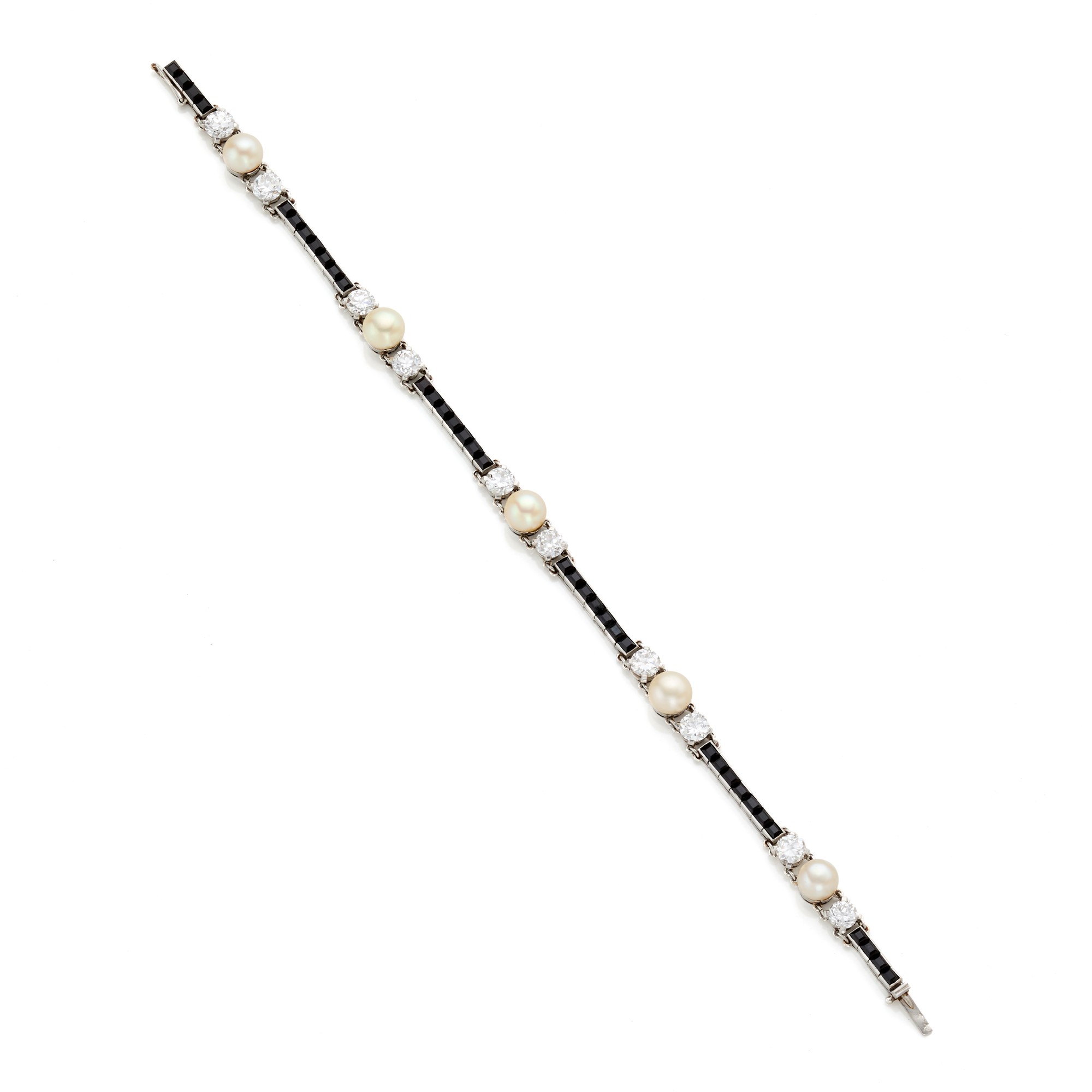 Platinum bracelet with round diamonds totalling approx. 3 ct, white cultured round pearls of approx. 6 mm, and onyx.