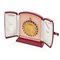 Bulgari 18 Kt yellow gold pendant medal depicting the Madonna, surrounded by sapphires and pearls, commemorative engraving on the back. Within original Bulgari Roma box.