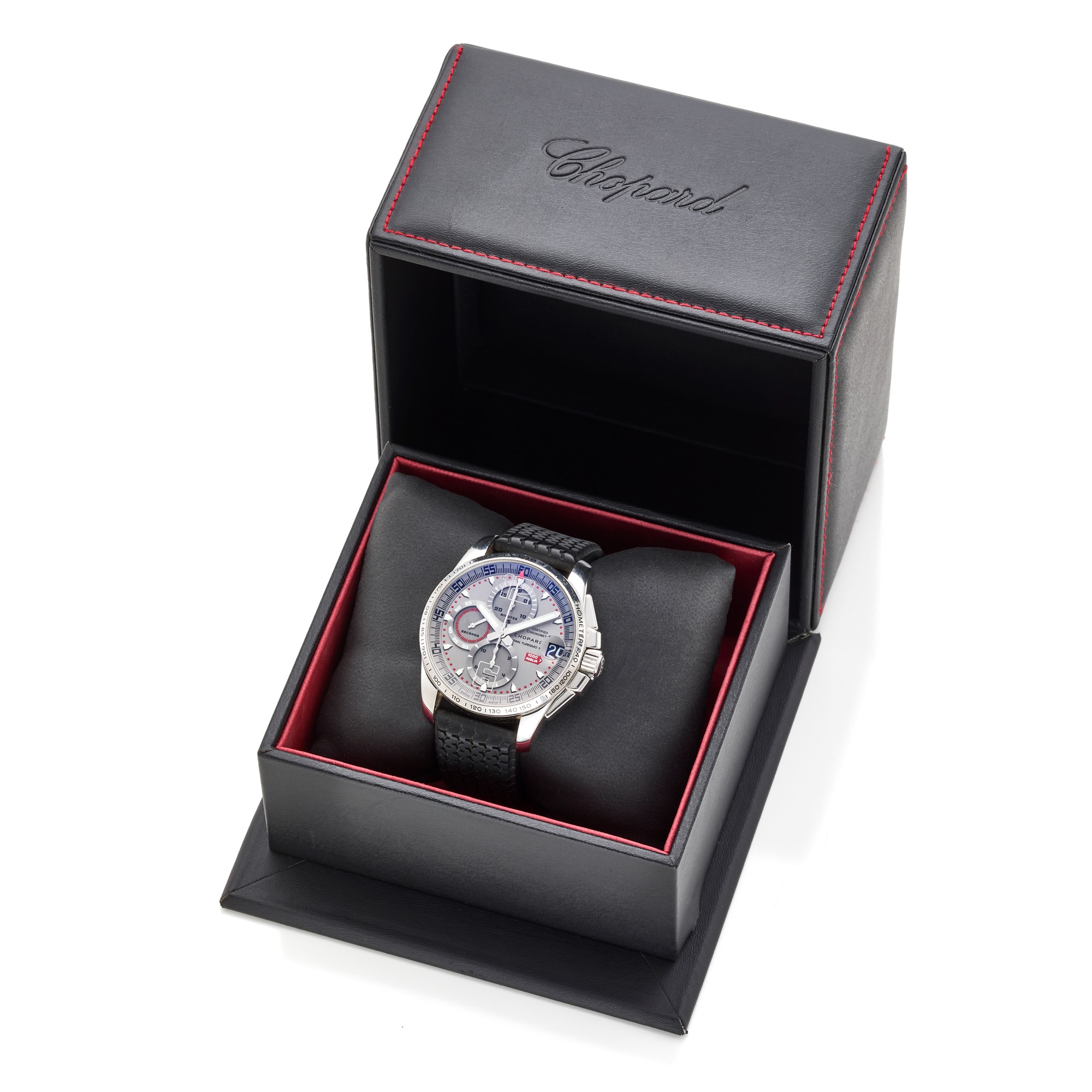 Chopard Gran Turismo XL Mille Miglia, ref. 8489, anni 2000. Cassa e deployante in acciaio con cinturino in caucciù. Cronografo movimento meccanico a carica automatica. Quadrante, cassa e movimento firmati. Corredato di astuccio. Buone condizioni.
