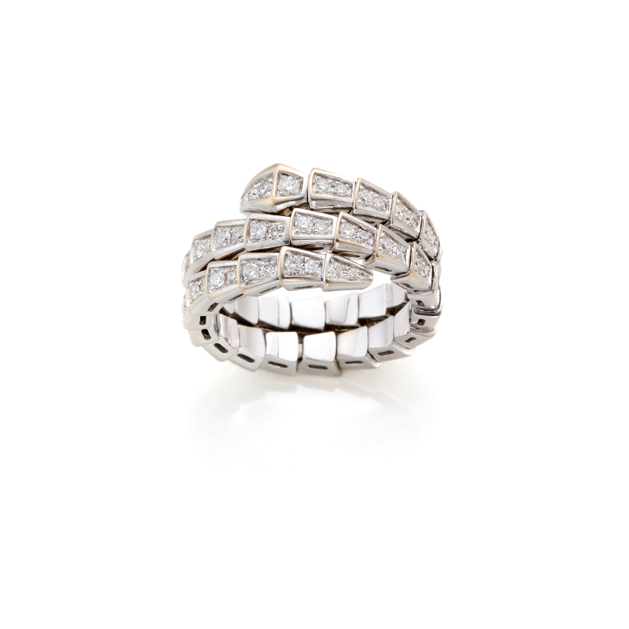 Anello Bulgari collezione Serpenti Viper in oro bianco 18 Kt a doppia spirale con diamanti rotondi per complessivi circa 1,60 ct.