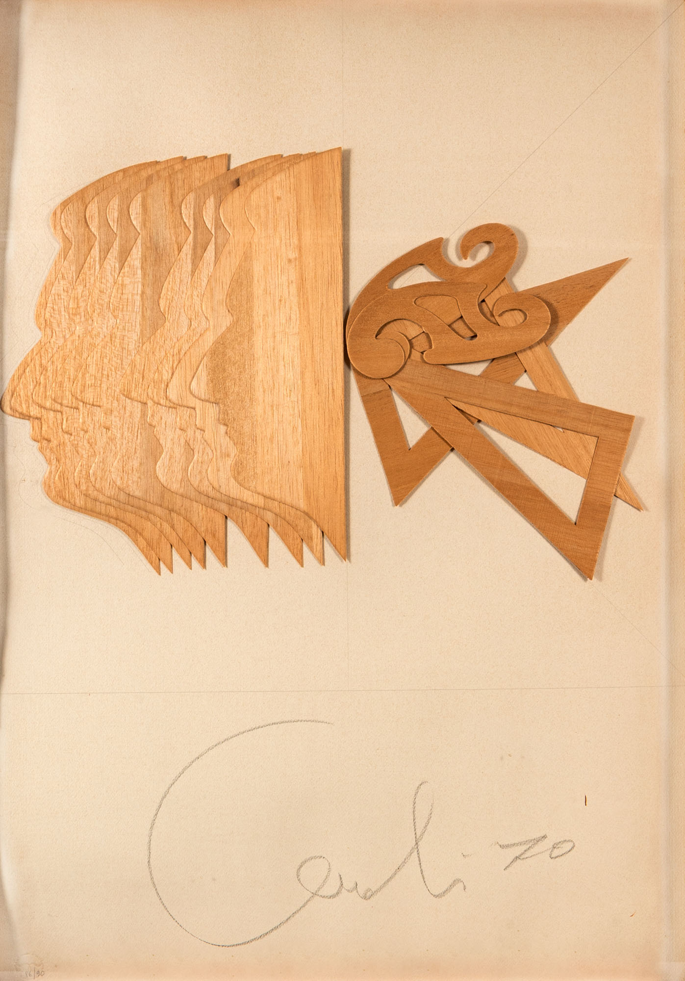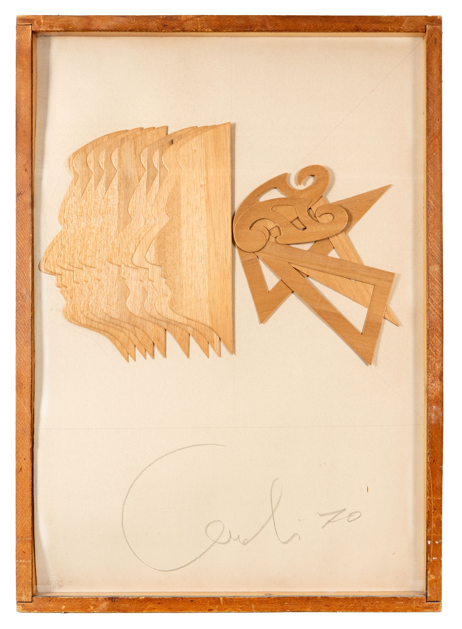 MARIO CEROLI(1938)Profili e squadre1970Multiplo in balsa su cartoncino, es. 86/90, Edizione l'Ariete, Venezia (timbro a secco), entro cornice in legno104,5 x 74,5 cmFirmato e datato a matita in basso al centro, numerato in basso a sinistraPROVENIENZA:Collezione privata, Modena