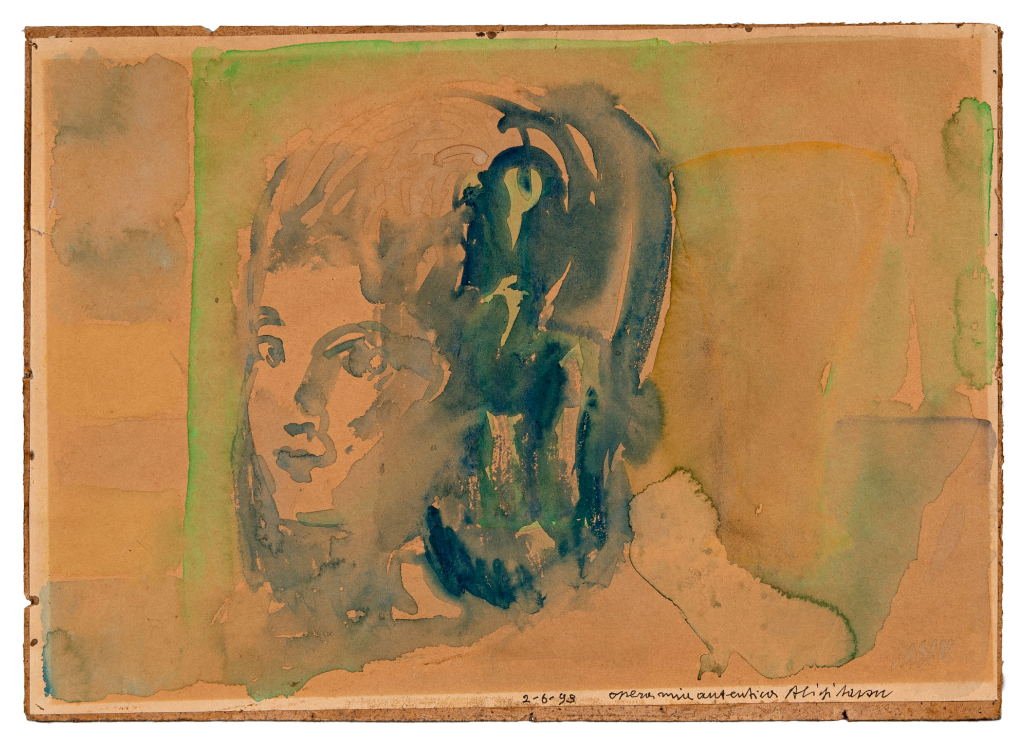 ALIGI SASSU(1912 - 2000)Senza titolo1999Acquerello su carta applicata su masonite25 x 35 cmFirmato in basso a destra e datato in basso al centroDichiarazione di autenticità in basso a destraPROVENIENZA:Collezione privata, Como