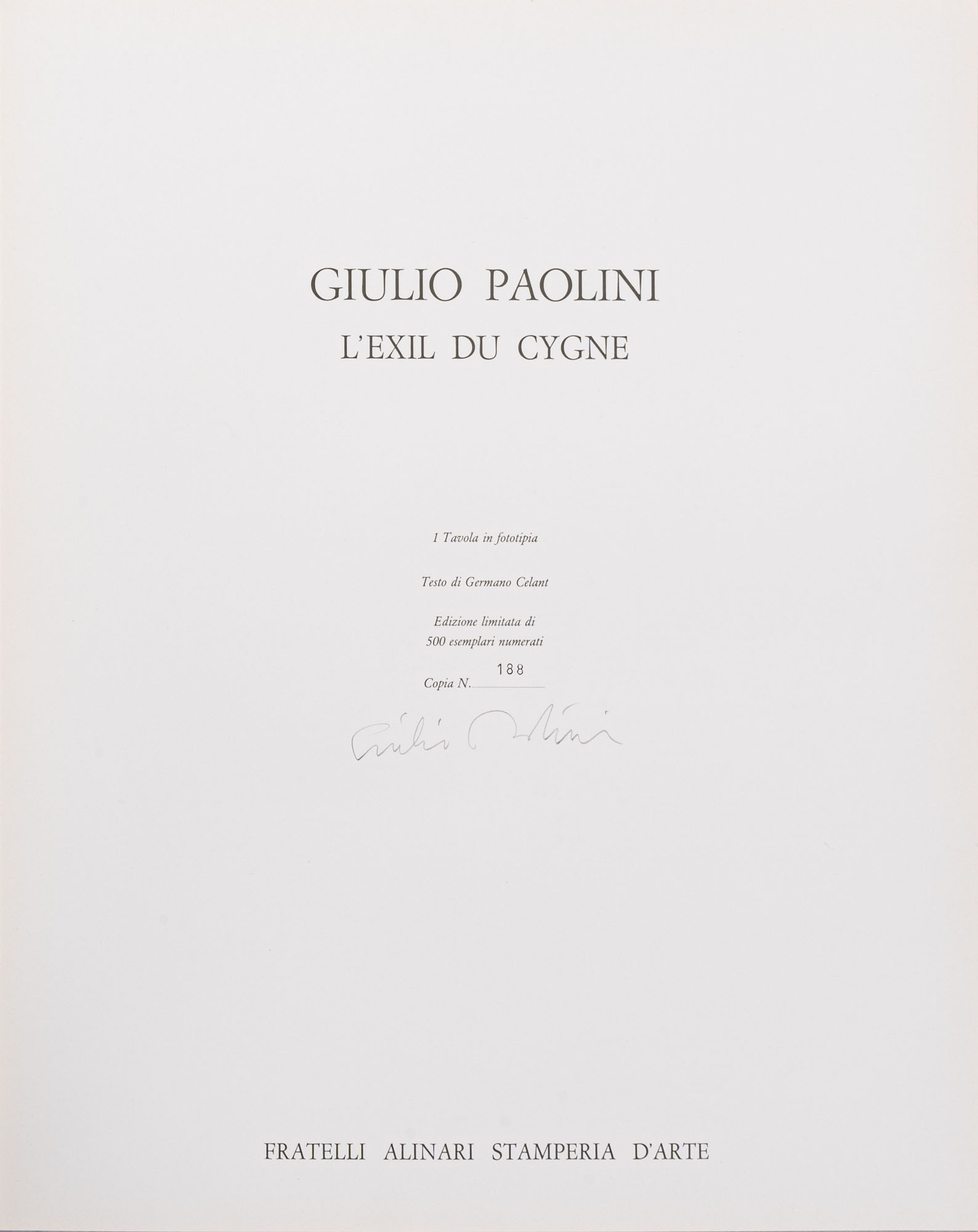 GIULIO PAOLINI(1940)L'exil du cygne1984Tavola in fototipia con testo di Germano Celant, es. 188/500, Edizioni Fratelli Alinari Stamperia d'Arte, FirenzeDimensioni della cartella 52 x 42 cmDimensioni della fototipia 50 x 80 cmFirmata e numerata sul frontespizioBIBLIOGRAFIA:M. Disch, Giulio Paolini. Catalogo ragionato 1960 - 1999, vol. 2, Skira Editore, Milano, 2008, n. 513, p. 524G. Paolini, Impressions graphiques. L'opera grafica 1967 - 1992, Marco Noire Editore, Torino, 1992, n. 44 (con datazione errata '1983'), (ill.)