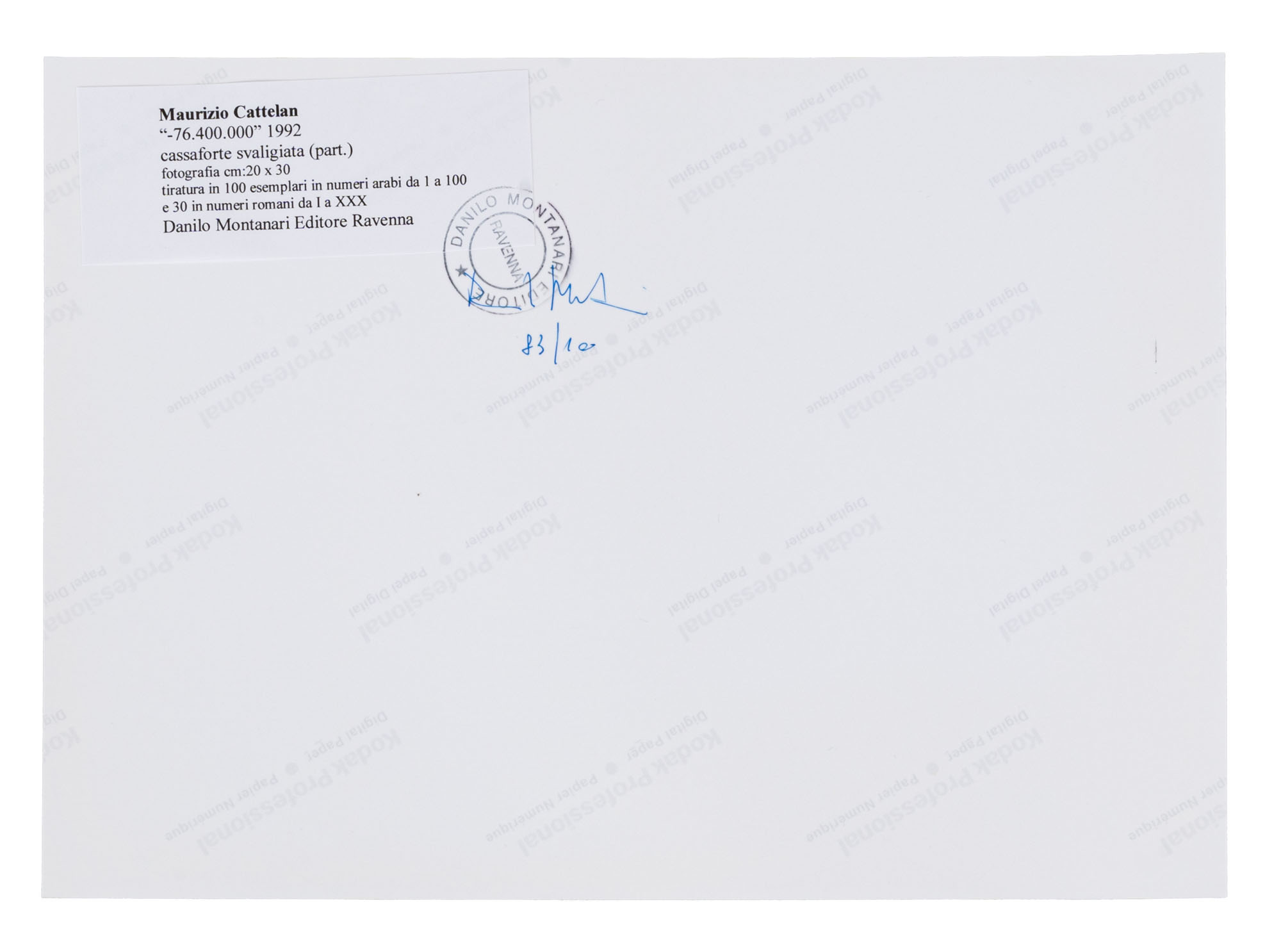 MAURIZIO CATTELAN(1960)Cassaforte svaligiata (part.) - 76.400.0001992Cartella contenente una stampa cibachrome, ed. 83/100 su una tiratura complessiva di 100 esemplari in numeri arabi e 30 in numeri romani, Danilo Montanari Editore, RavennaDimensioni della cartella: 32 x 22 cmDimensioni della stampa cibachrome: 20 x 27,8 cmTimbro e firma Danilo Montanari Editore e numerazione al retro della stampa cibachromePROVENIENZA:Collezione privata, Milano