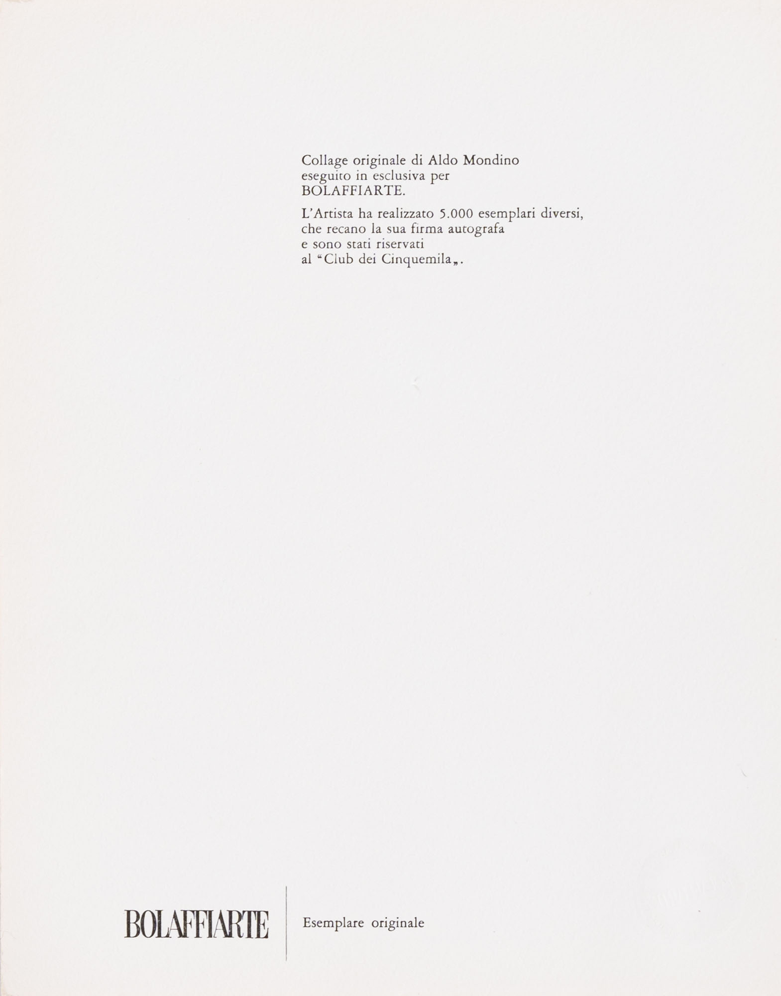 ALDO MONDINO(1938 - 2005)CollageCollage su cartoncino, es. multiplo non numerato su 5000 esemplari diversi30 x 23,5 cmFirmato a matita in basso al centroPROVENIENZA:Collezione privata, Pavia