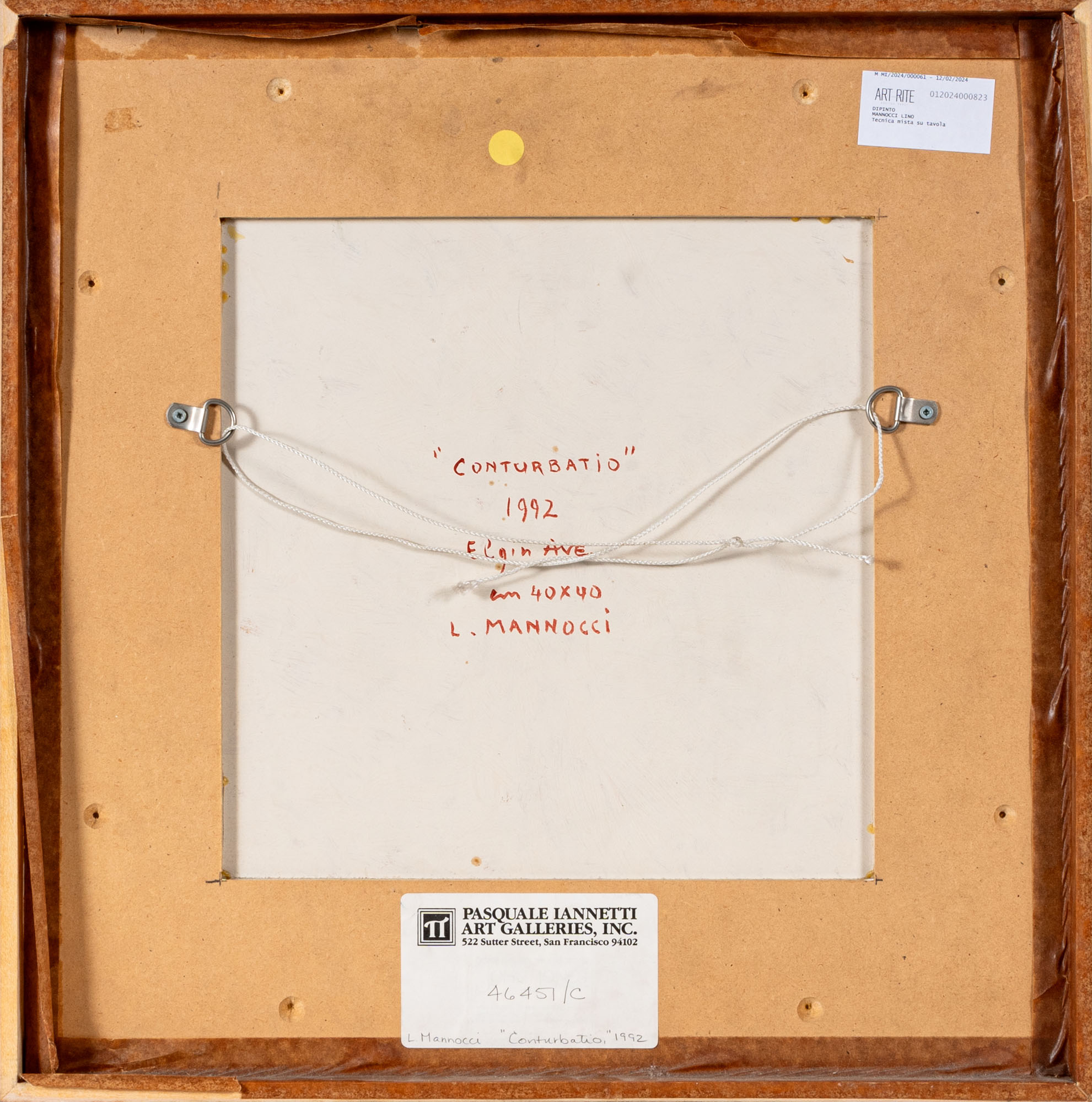 LINO MANNOCCI(1945 - 2021)Conturbatio1992Tecnica mista su tavola40,3 x 39,3 cmFirma, data e titolo al retroPROVENIENZA:Pasquale Iannetti Art Galleries, San Francisco (etichetta al retro)Collezione privata, Modena