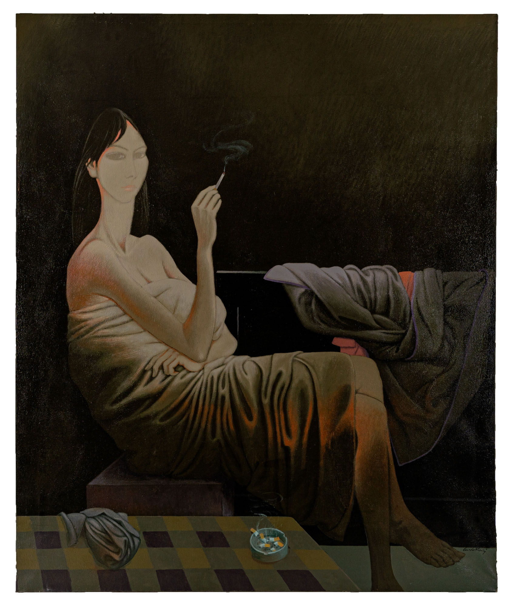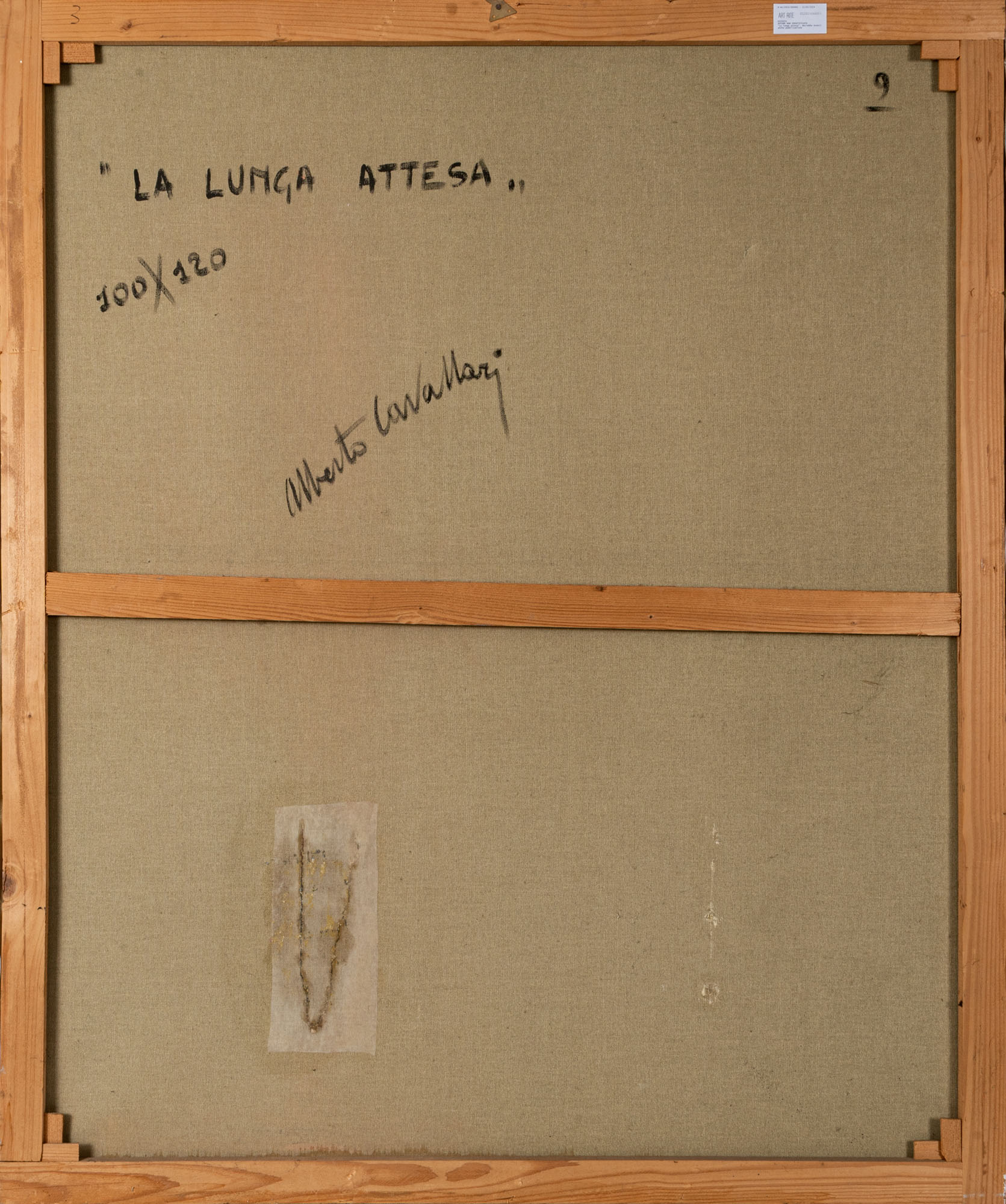 ALBERTO CAVALLARI(1924 - 2016)La lunga attesaTecnica mista su tela120 x 100 cmFirmato in basso a destraFirma e titolo al retroPROVENIENZA:Collezione privata, ModenaBIBLIOGRAFIA:C.F. Teodoro, Alberto Cavallari, Edizioni Rilievi, Soliera (MO), 1990, p. 18 (ill.)