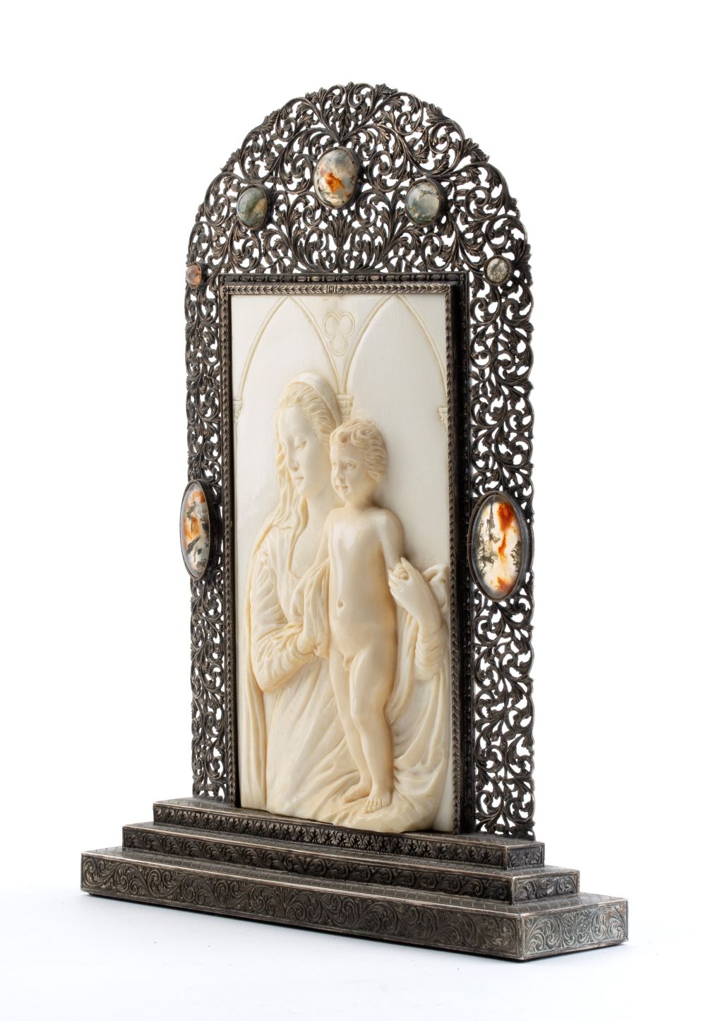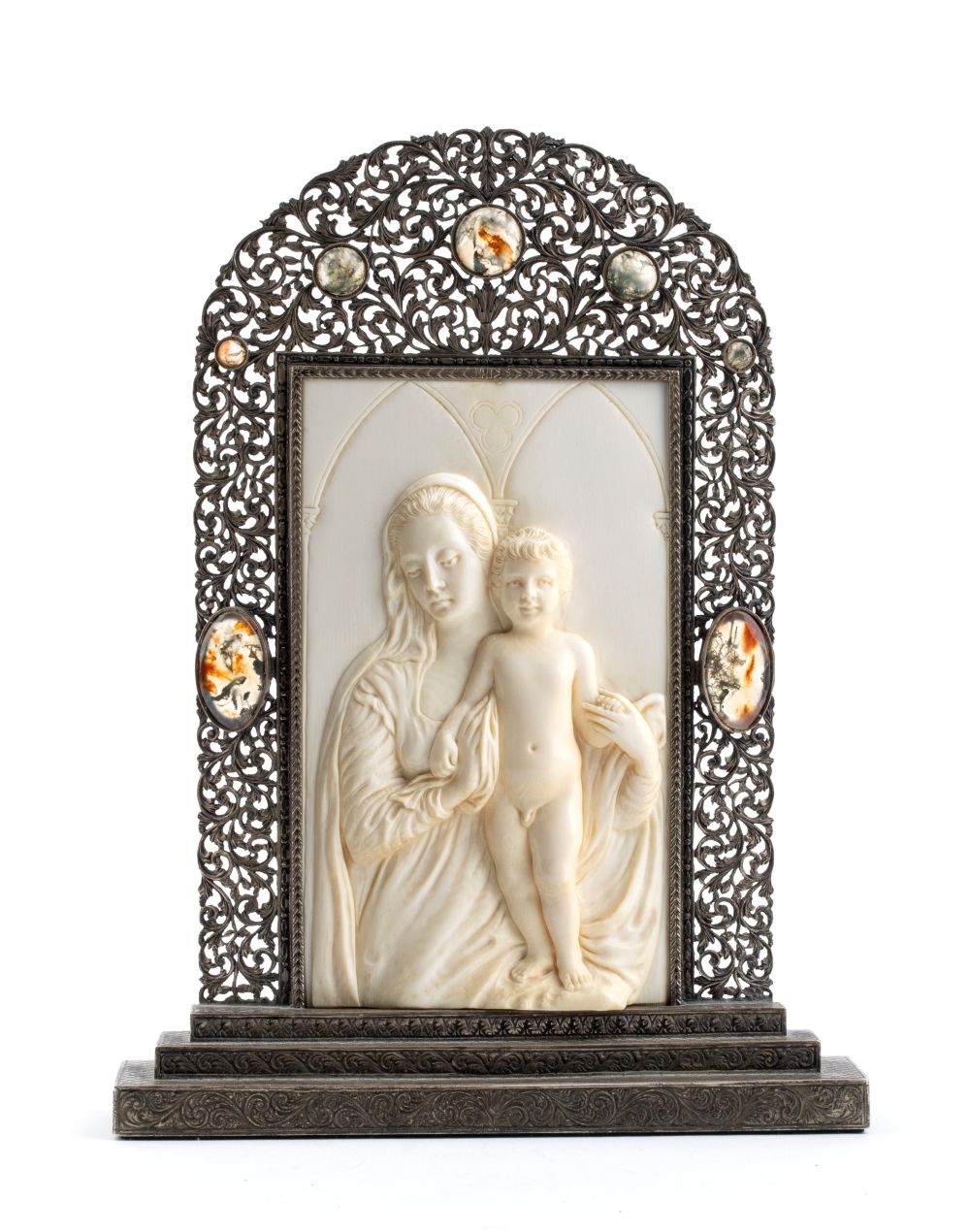 Il rilievo appartiene ad una tipologia ben nota; la Madonna è raffigurata a mezzobusto, vestita come di consueto con tunica, mentre Gesù Bambino è in piedi nudo e quindi lascia nudo il sesso. Si tratta di un’immagine che deriva da un prototipo della “Madonna col Bambino” di Andrea del Verrocchio conservata al Museo del Bargello di Firenze, che viene ripreso dai suoi allievi, dal Perugino al Ghirlandaio ma anche Piermatteo d’Amelia e Francesco di Simone Ferrucci, sia in pittura, sia in scultura, fin dagli anni settanta del quattrocento. L’opera è collocata in una cornice riccamente decorata con volute vegetali e incastonata con cabochon di agata muschiata (agata, varietà di calcedonio), pietra carica di buoni auspici e di favori spirituali in molte culture.