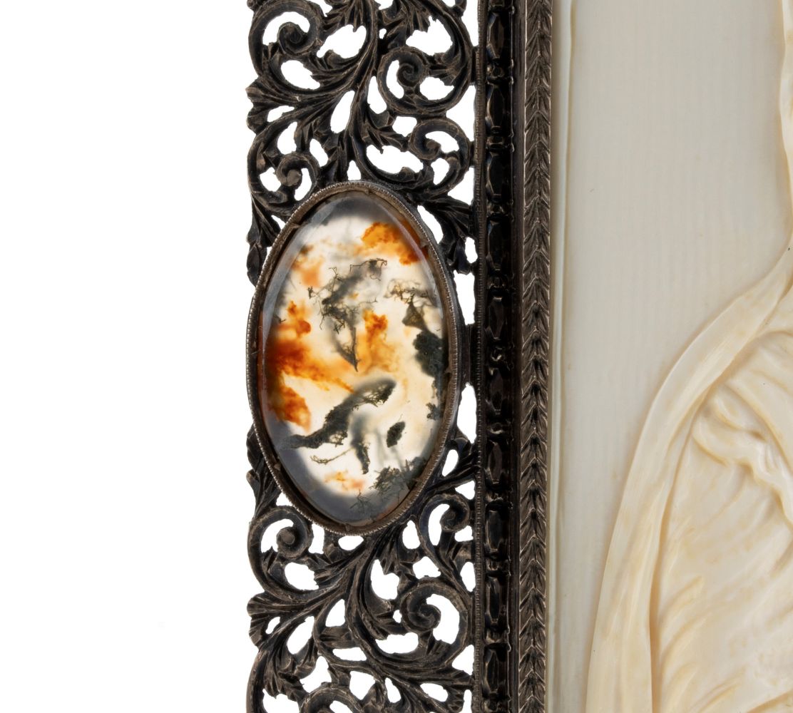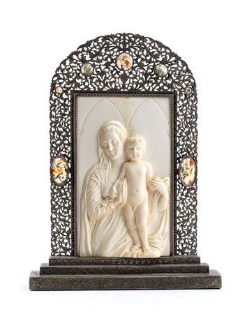 Scultura in avorio di elefante raffigurante Madonna con Bambino con cornice argento Anni '30