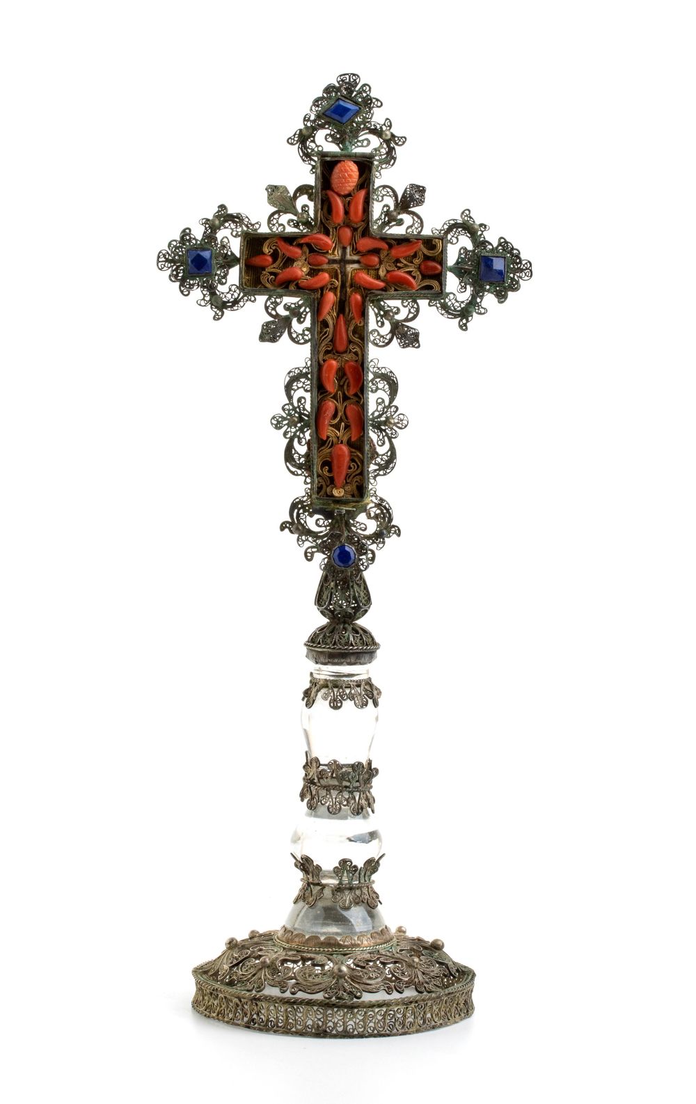 Oreficeria siciliana Croce reliquiario in argento e corallo Sicilia, XVIII...