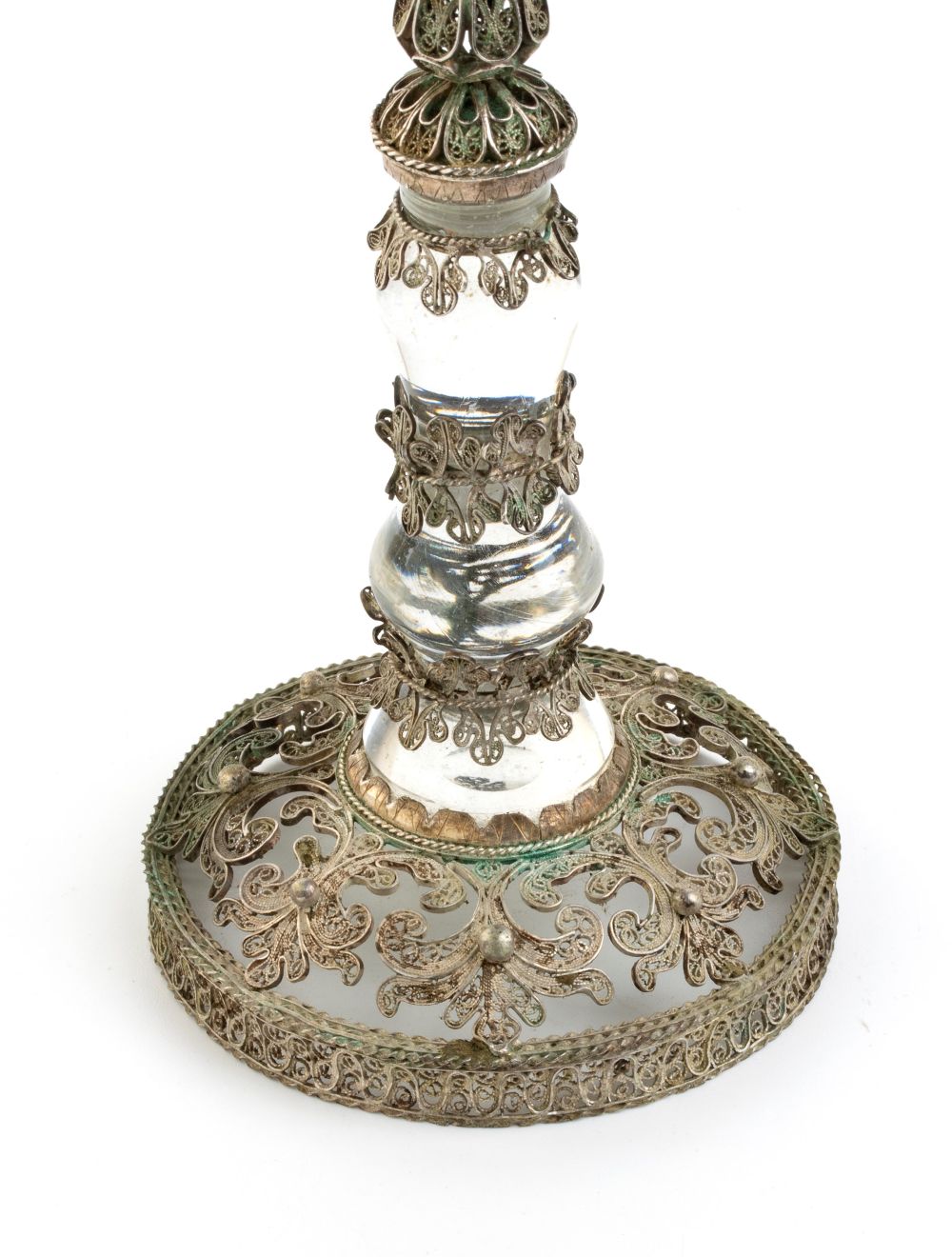 l'opera presenta una base circolare interamente realizzata in filigrana d'argento sopra la quale si innesta un blocco di cristallo di rocca curvilineo, sopra zegue un nodo che sostiene la croce anch'essi in filigrana