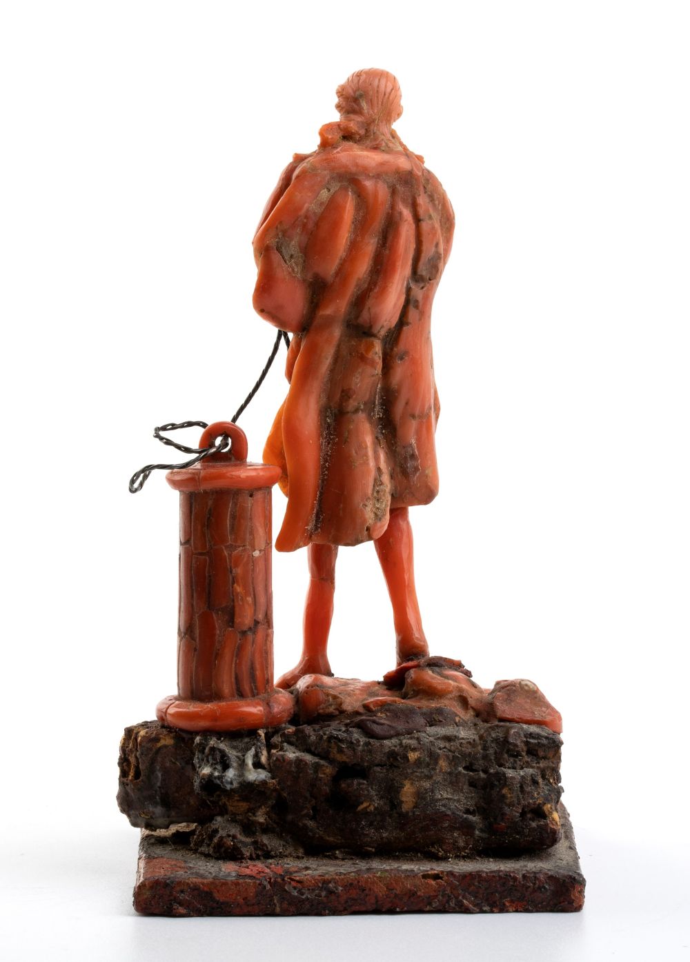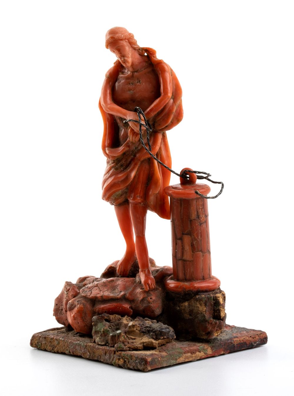 in corallo mediterraneo (corallium rubrum), raffigurazione convenzionale di Cristo flagellato e legato alla colonna; questa piccola scultura rappresenta uno dei cinque Misteri Dolorosi, ovvero: l'agonia di Gesù nel Getsemani, la flagellazione di Gesù alla colonna, Gesù coronato di spine, la salita di Gesù al Calvario sotto il pesante legno della Croce e la crocifissione e morte di Gesù dopo tre ore di agonia.
