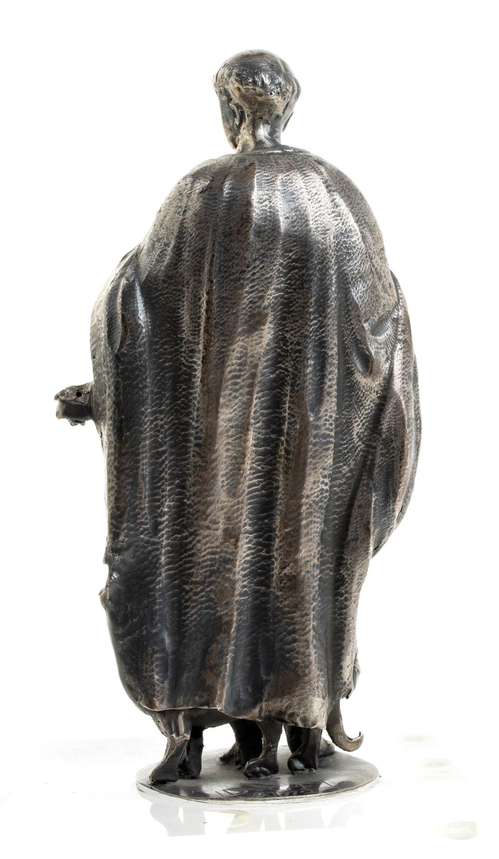 in argento da lastra, raffigurante San Vito, raffigurato a tutto tondo con un cane. Apparentemente non punzonato, testato con acido e pietra di paragone. Al verso in vasso l'iscrizione "D.G.F. - A 1772". Posto su un basamento in plexiglass.
