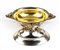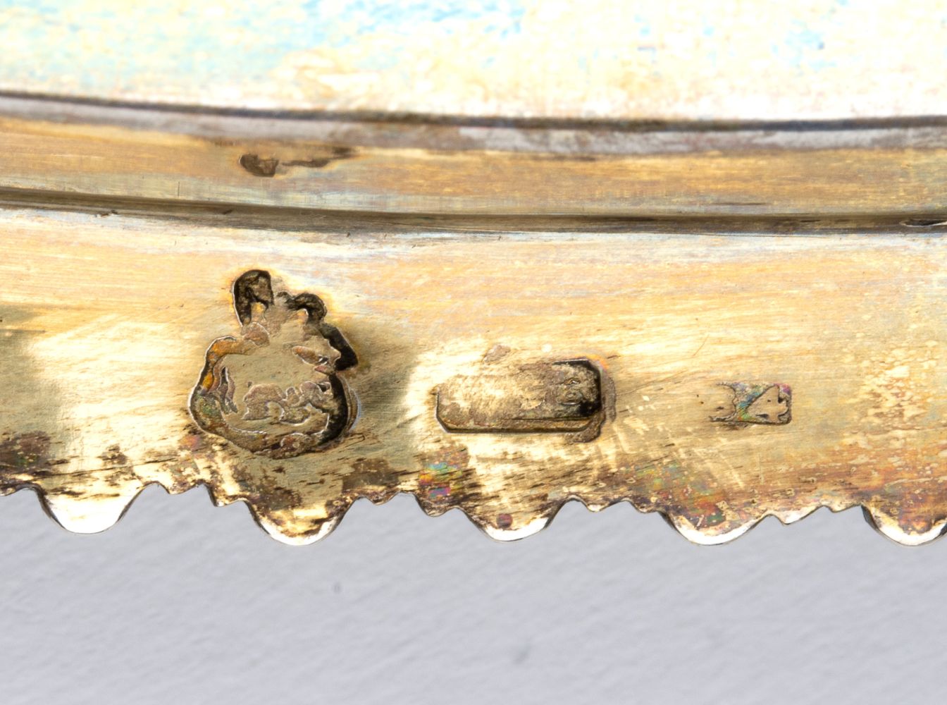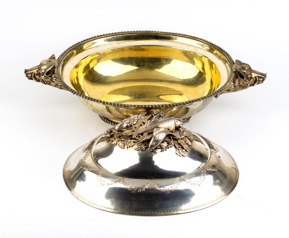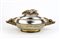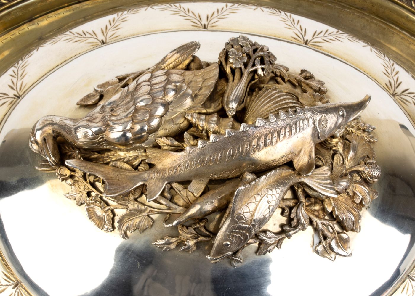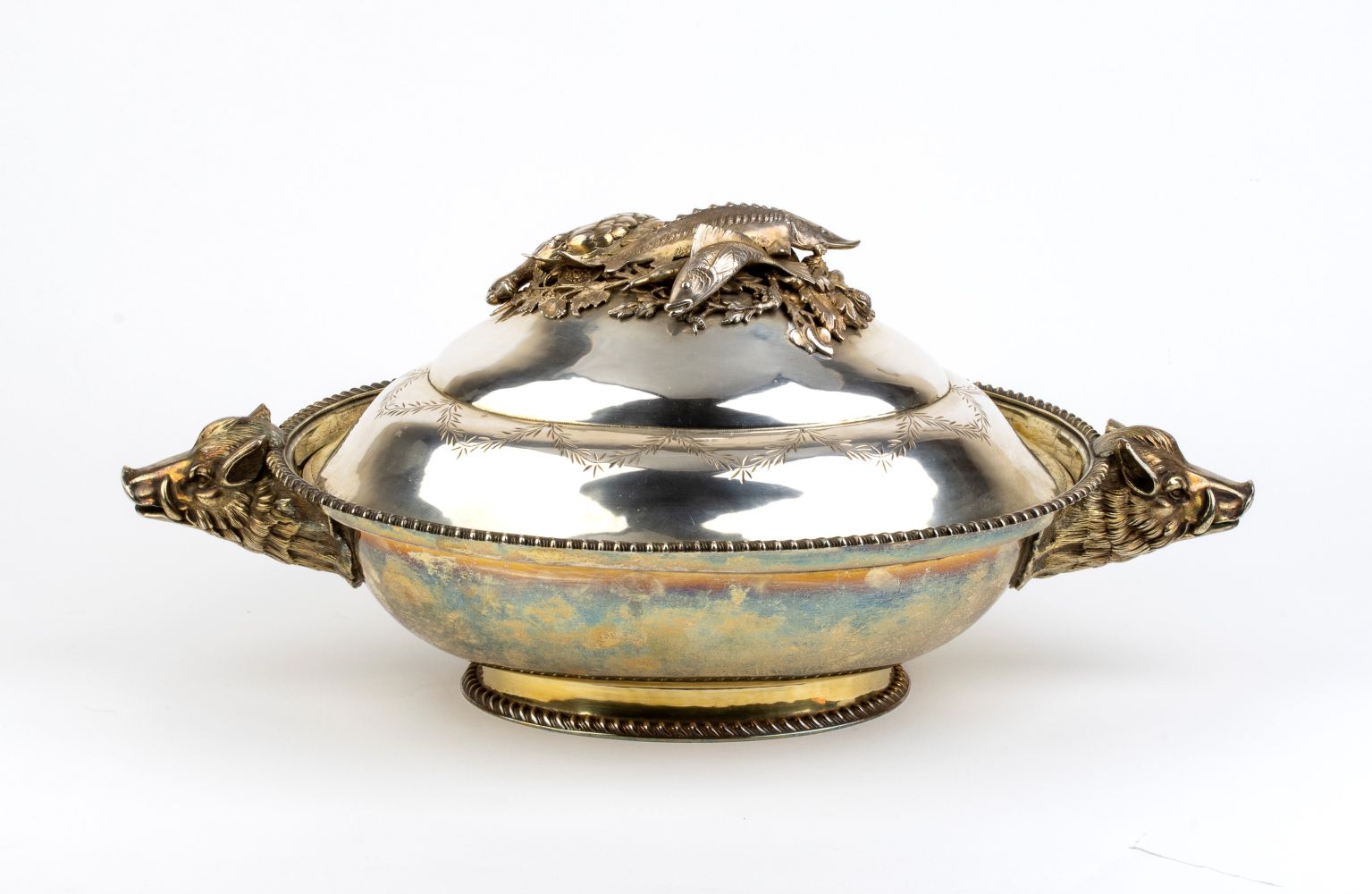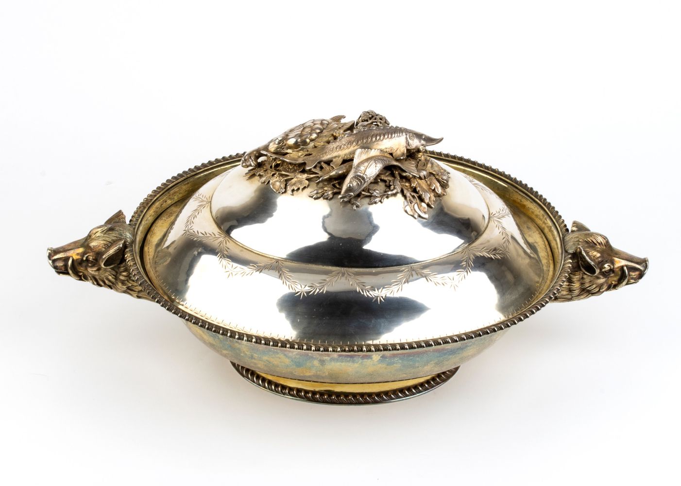 di forma ovale in argento vermeille con manici laterali a forma di testa di cinghiale e presa del coperchio modellata con anatra, pesciconchiglie e foglie. Argento 875/1000, punzonate con i marchi per l'argento al titolo di 84 zolotniks (875/1000) in uso a Mosca nel 1796 e con il marchio "800" in contorno ovale in uso in Italia nel XX secolo.