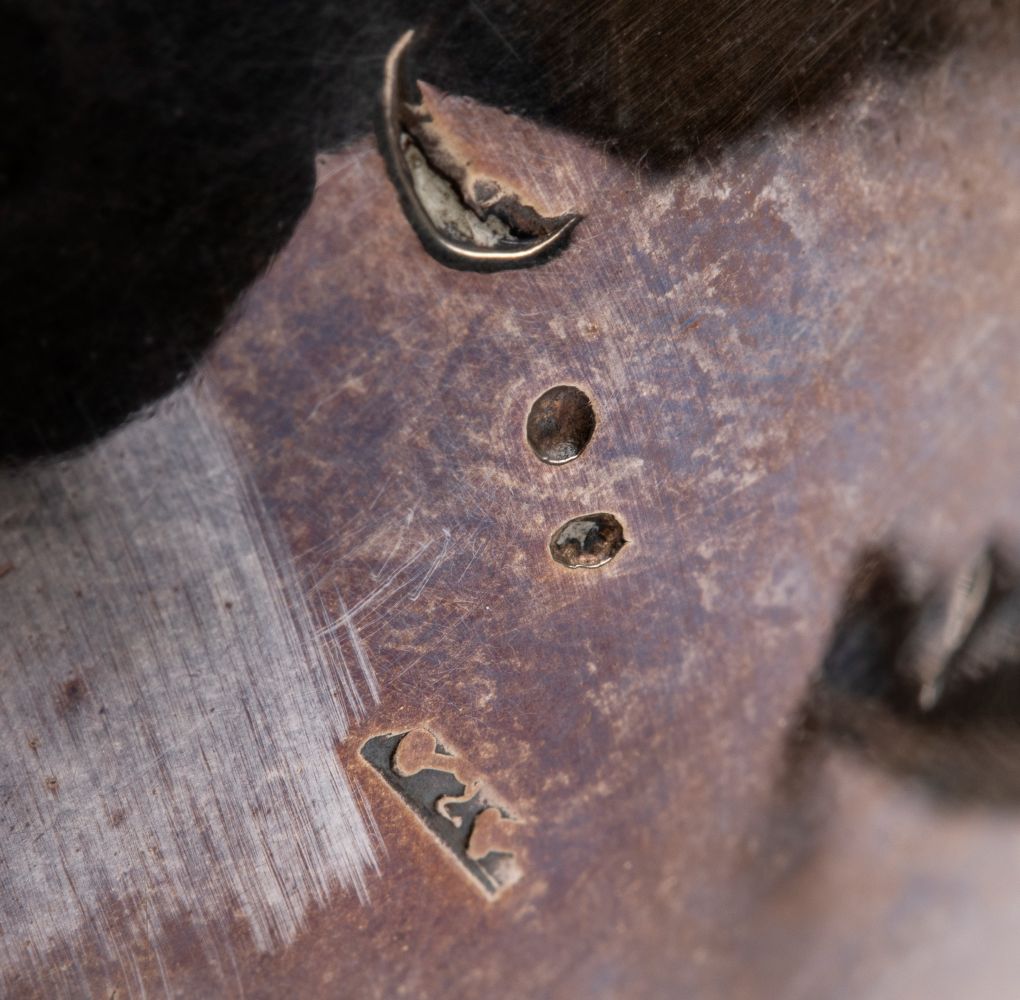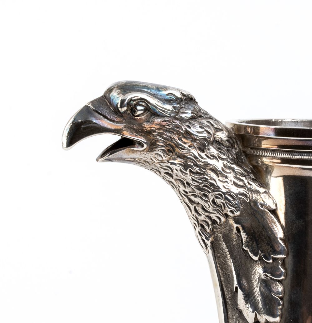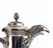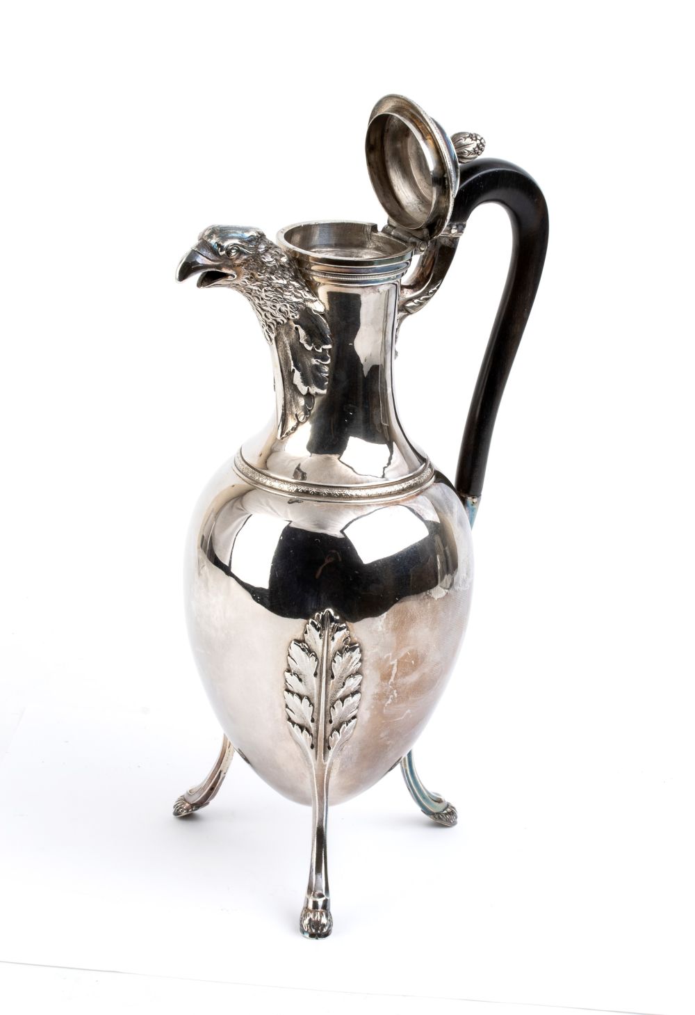 corpo ovoidale liscio poggiante su tre piedini con estremità a zoccolo e attaccatura superiore a foglie d'alloro; beccuccio a testa di rapace, coperchio incernierato con presa a pigna, manico ad ansa in ebano. Argento 950/1000, punzonata con i marchi per l'argento al primo titolo in uso a Parigi dal 1798 al 1809, con il marchio non ufficiale utilizzato dall'Association des Orfévres di Parigi per l'argento al primo titolo di 950/1000 "testa di cinghiale" e con le iniziali J.N.B.dell'argentiere Jean-Nicolas Boulanger.