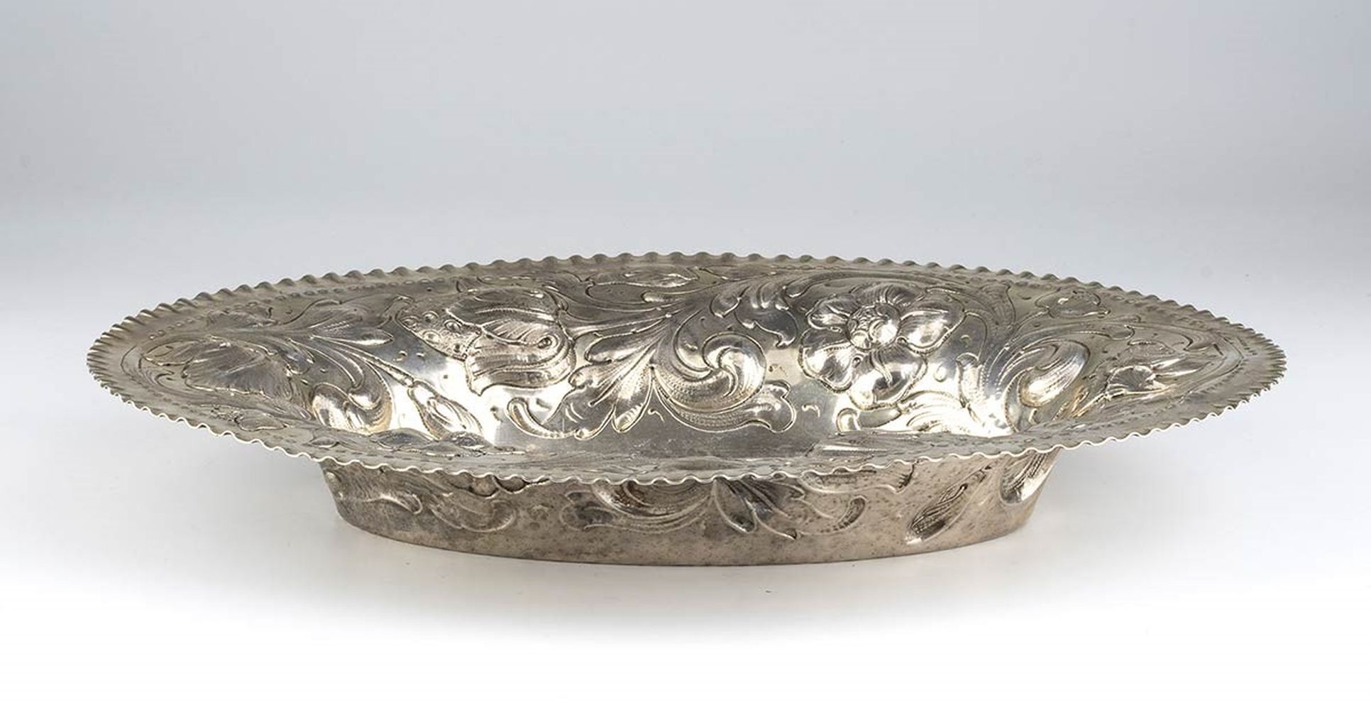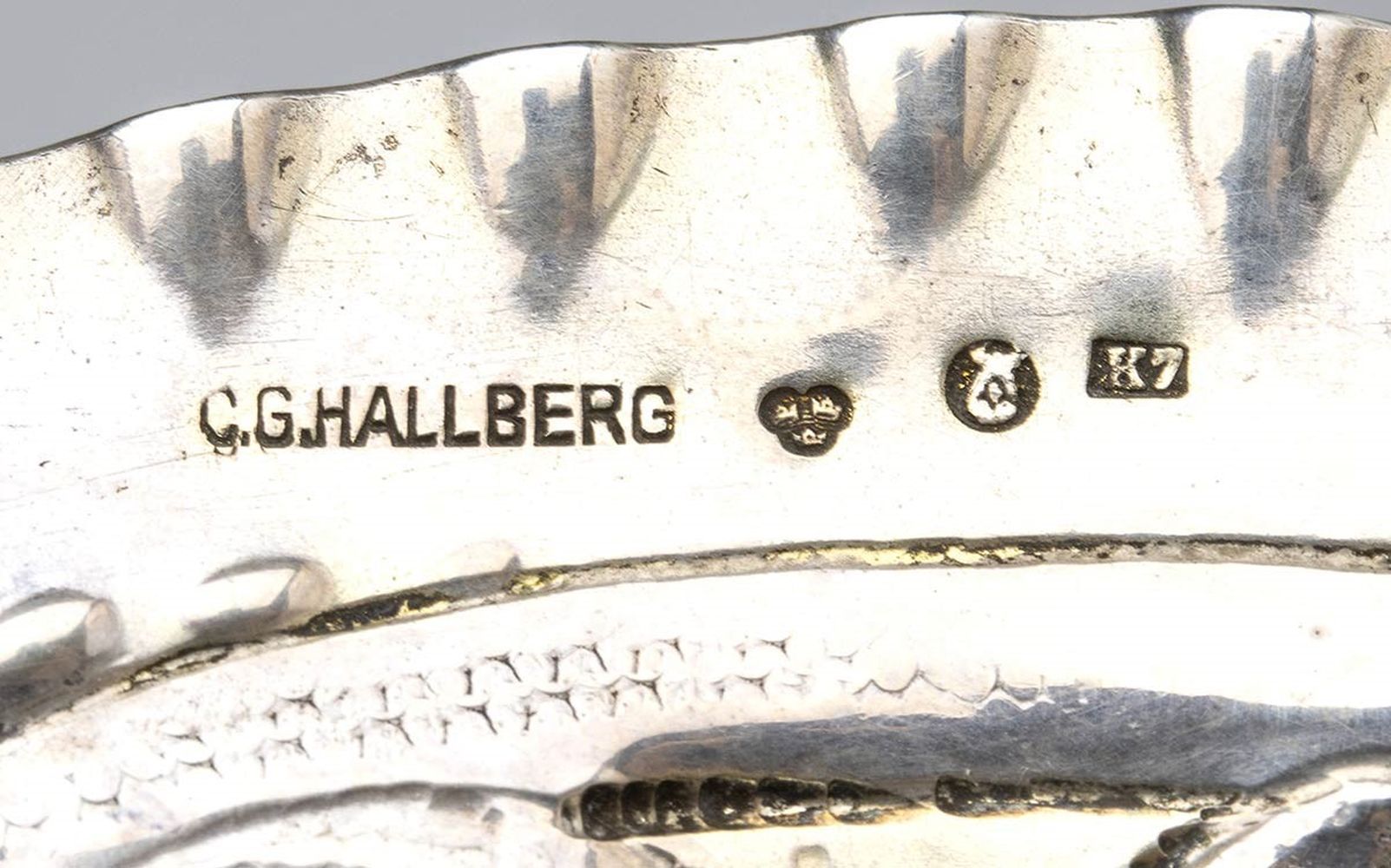 di forma ovale, interamente sbalzato e cesellato con fiori foglie. Argento 800/1000, punzonato con i marchi in uso a Stoccolma nel 1912 (K7), argentiere Gustav Mollenberg (C.G. Hallbergs Guldsmeds AB). C.G. Hallberg was a prominent Swedish goldsmiths and jewelers, jeweler to the Swedish Court.
