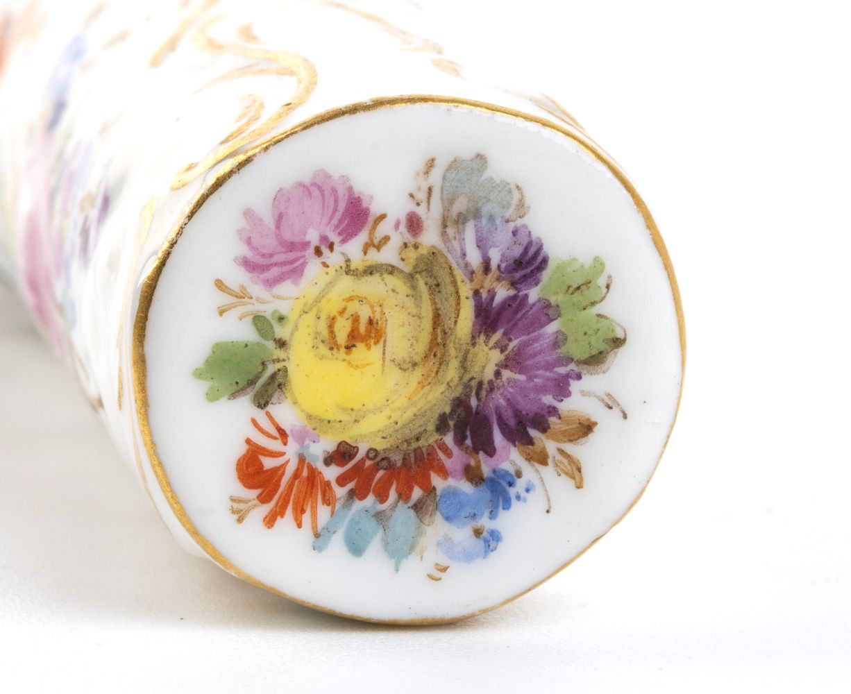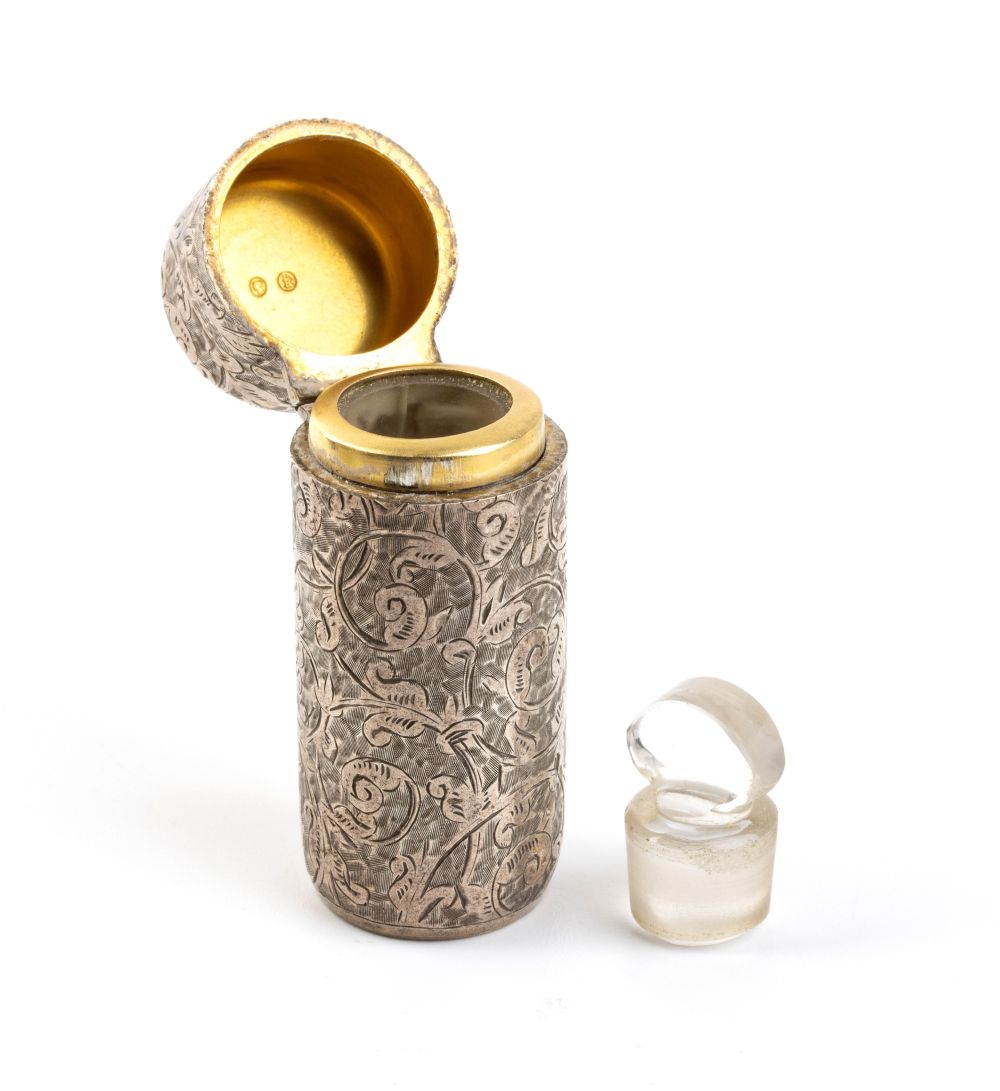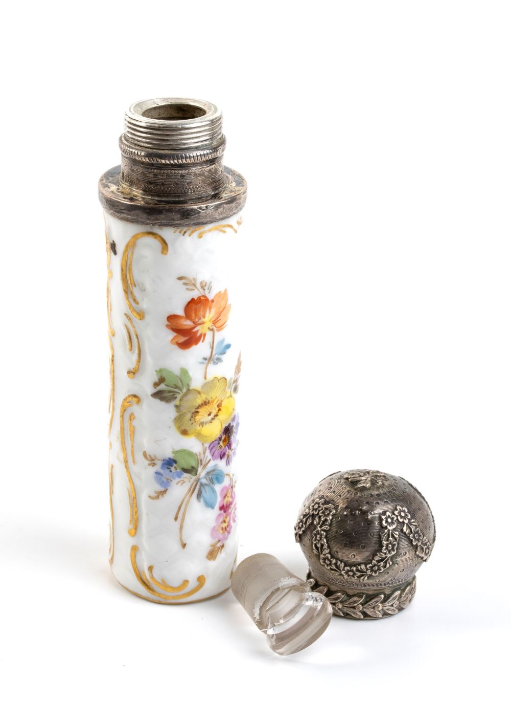 b) Bottiglia per profumo in argento e porcellana con decorazioni floreali policrome, punzonata con marchi non identificabili, probabilmente francesi.
