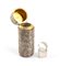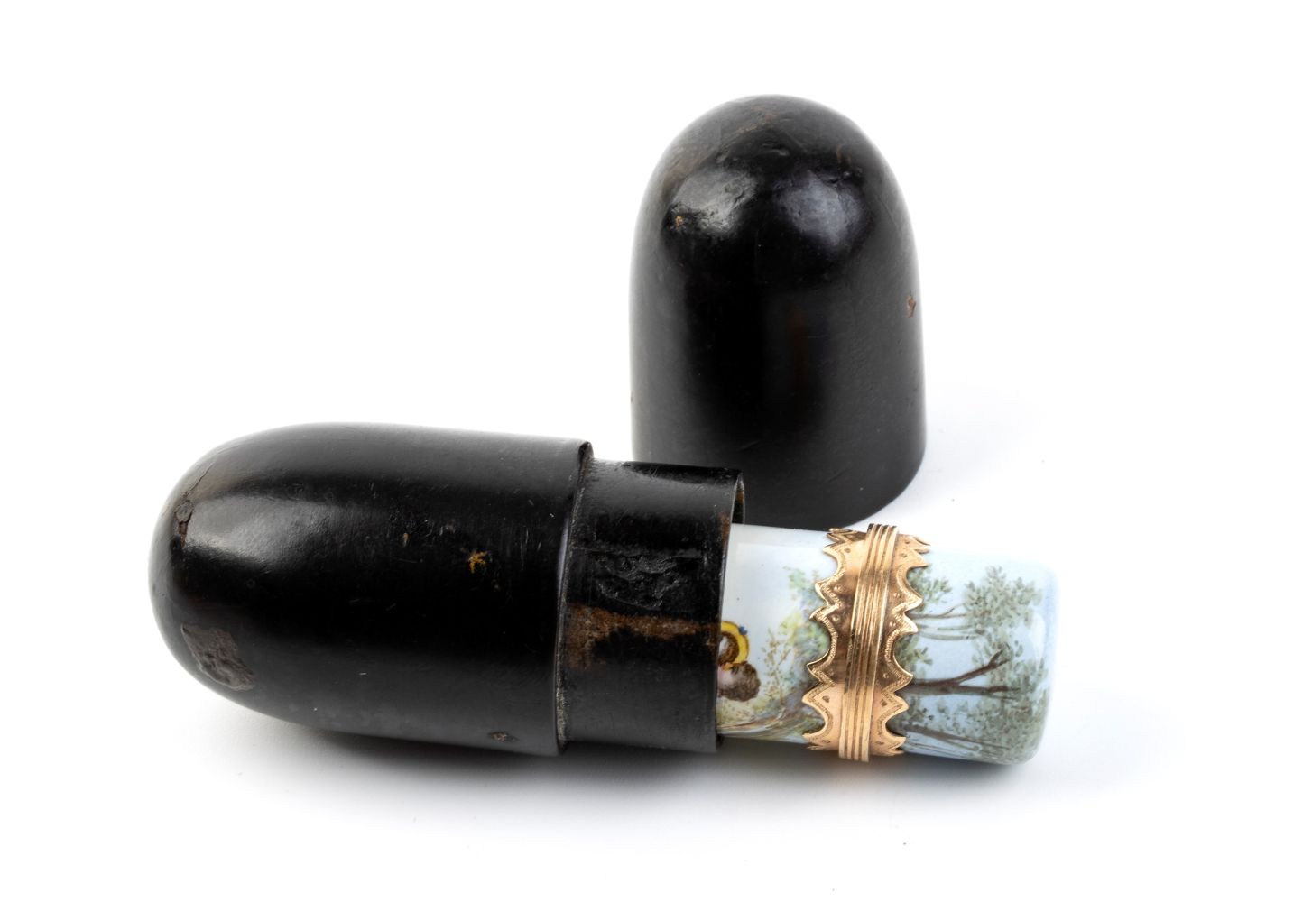 c) Bottiglia per profumo in metallo dorato e porcellana con decorazioni floreali policrome, punzonata con marchi non identificabili, probabilmente francese. Astuccio originale.