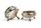 di forma circolare poggianti su tre piedini, interno dorato. Argento 925/1000, serie completa di di marchi Londra 1863-1864, argentieri George John Richards & Edward Charles Brown.
