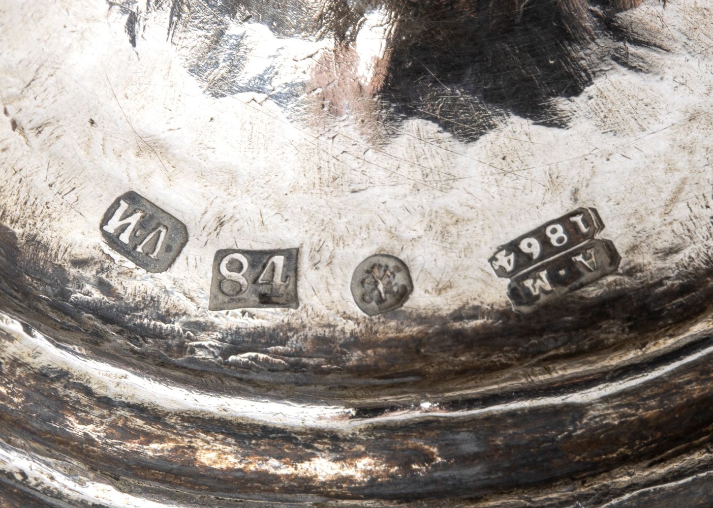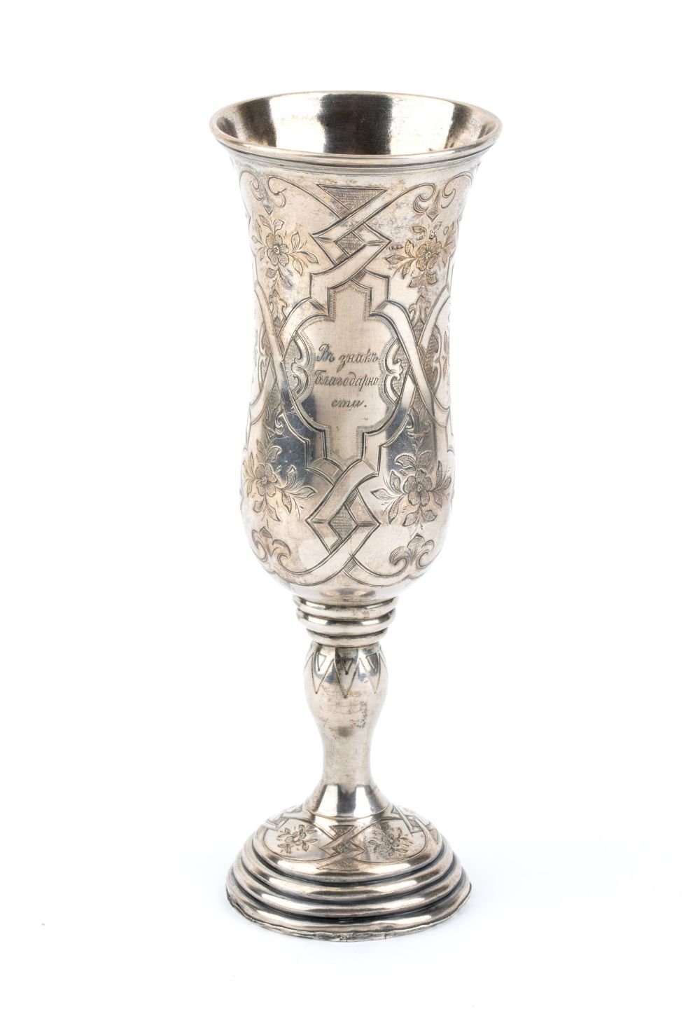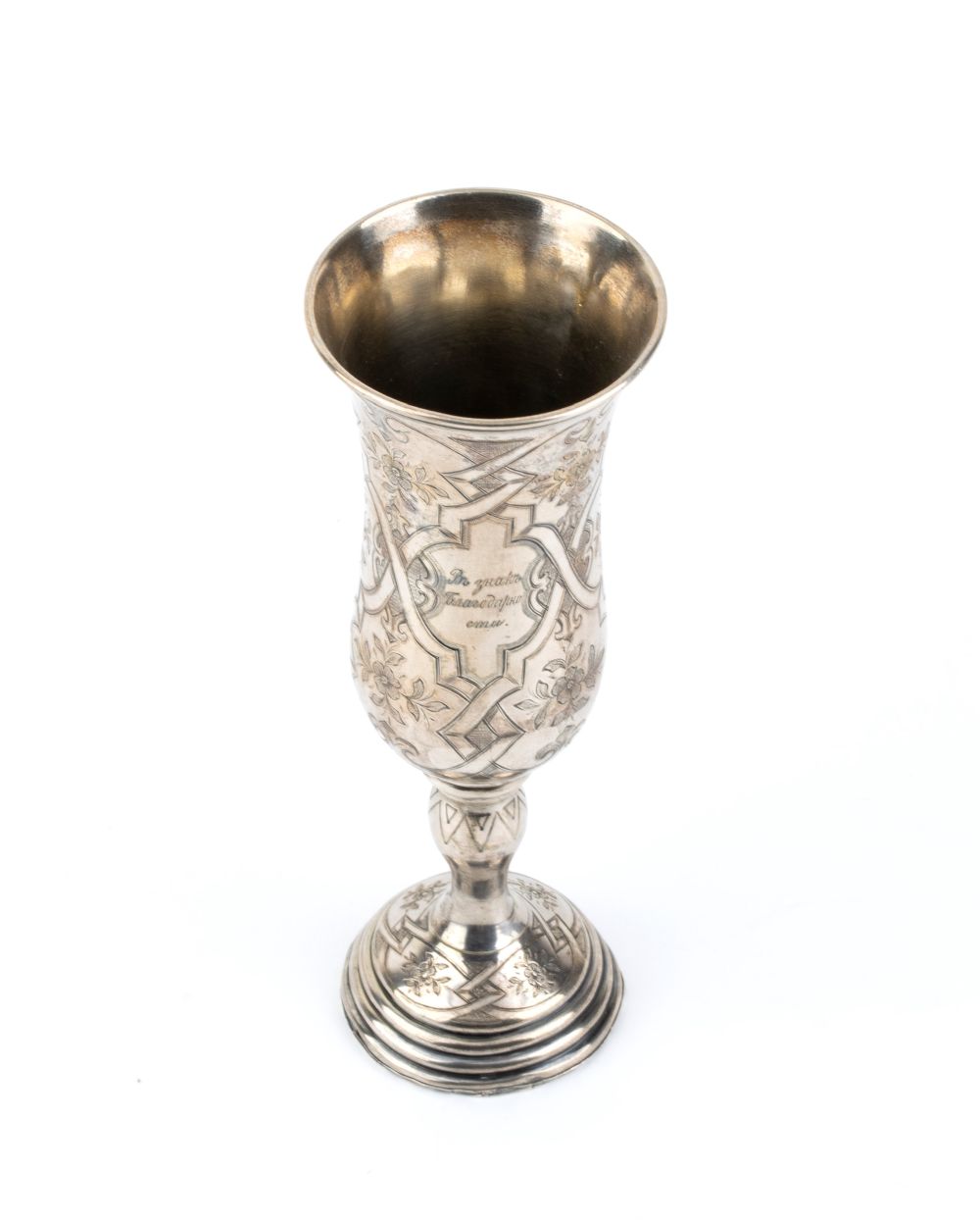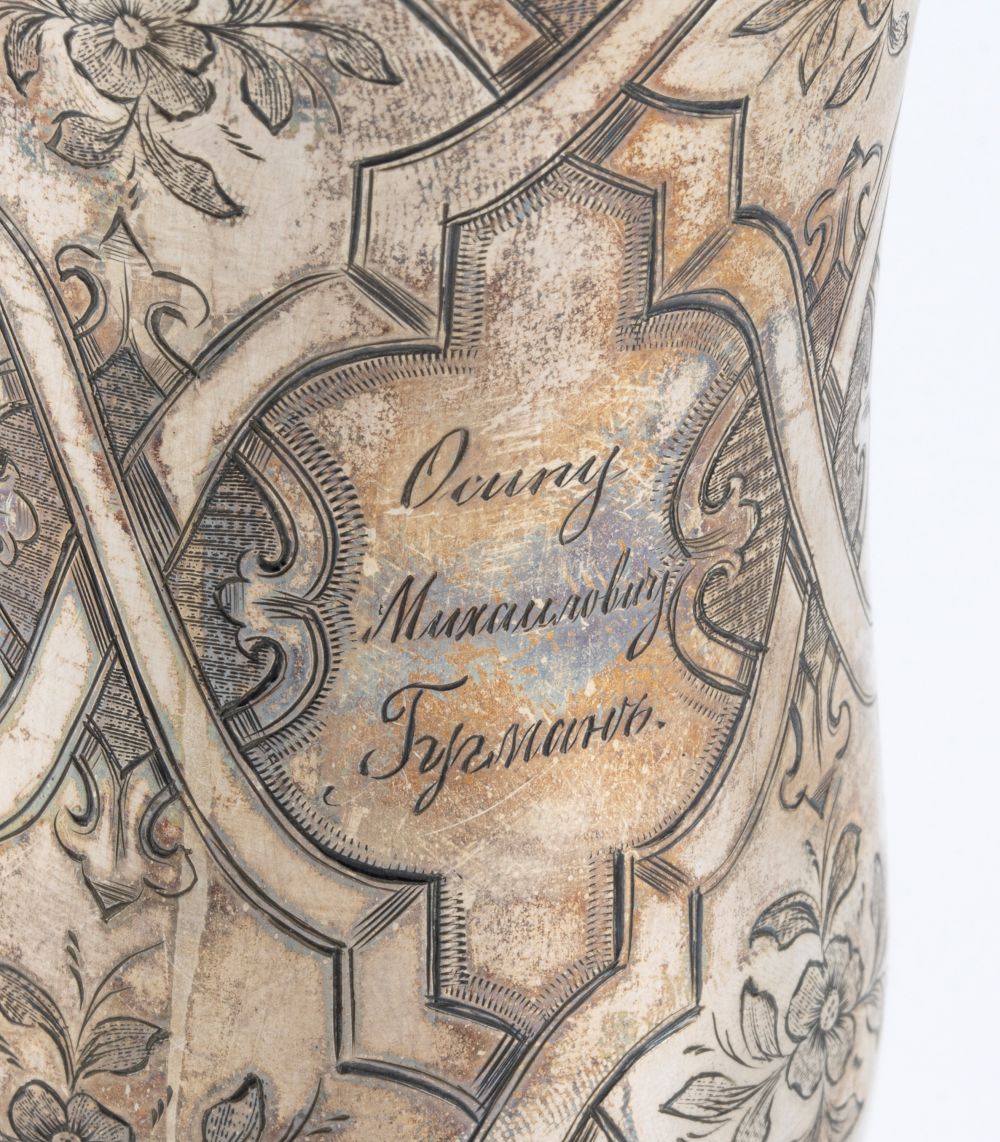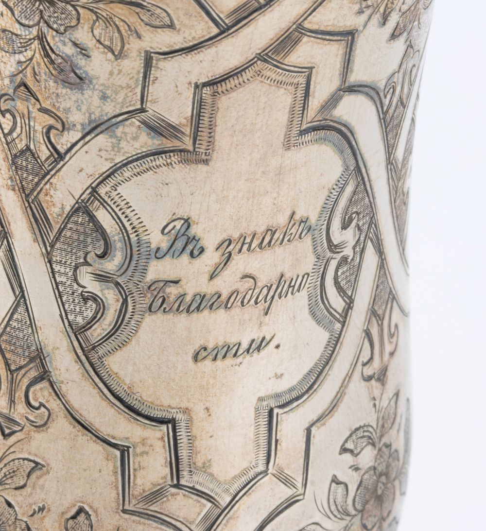 a forma di tulipano con base circolare, interamento inciso a motivi floreali. Serie completa di marchi per l'argento al titolo di 84 zolotniks (875/1000) in uso a San Pietroburgo nel 1864, assaggiatore Aleksandr Nikolayevich Mitlin, argentiere