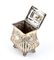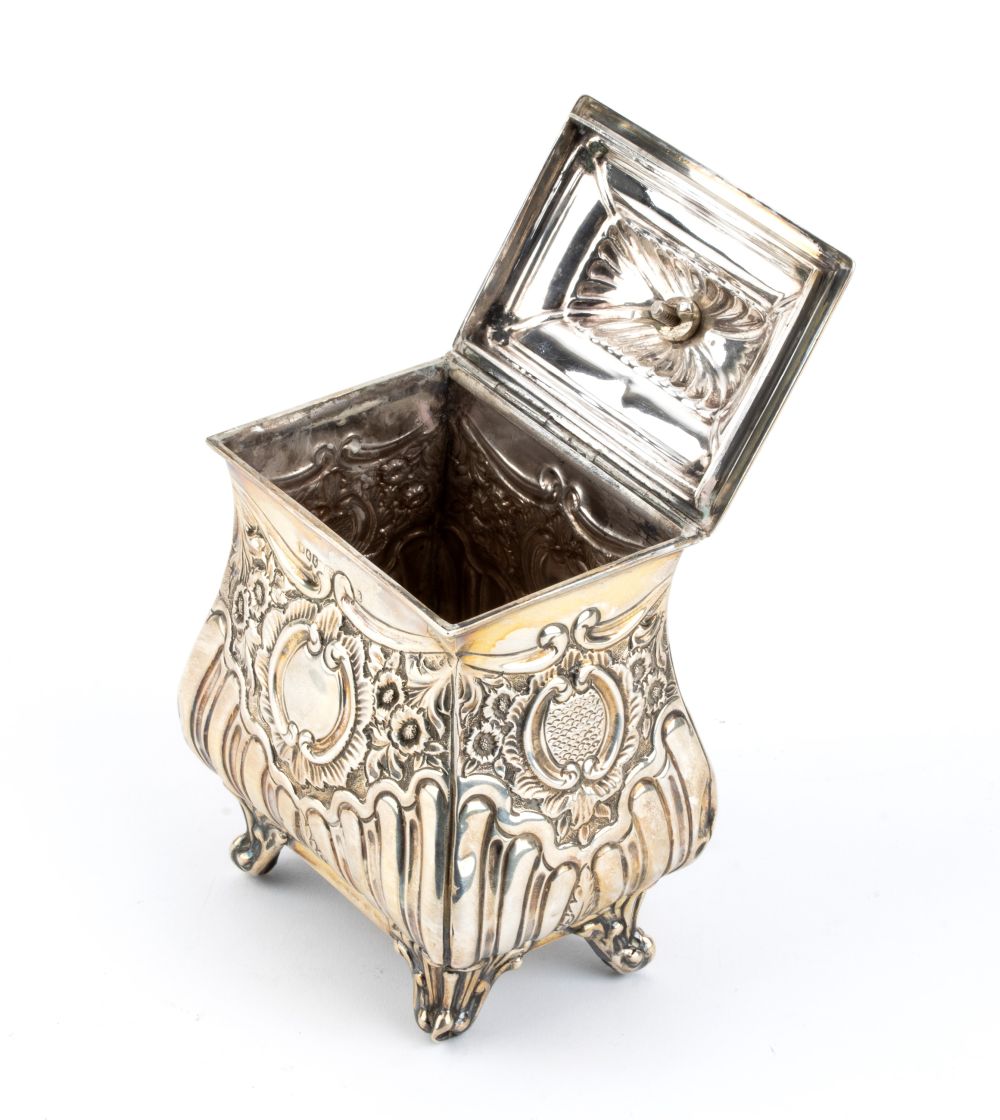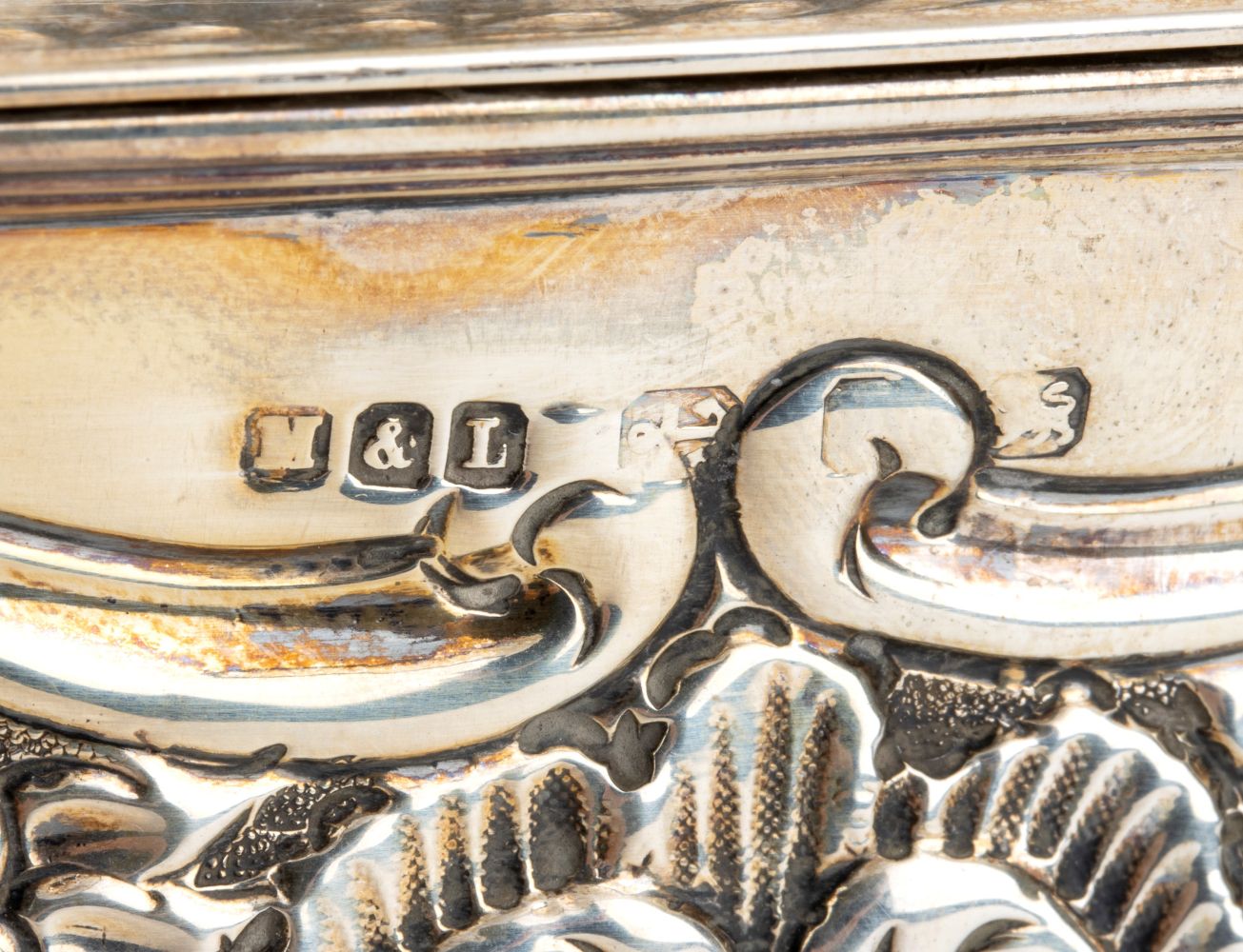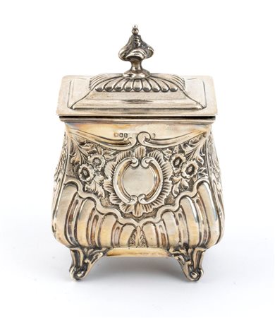 di forma rettangolare poggiante su quattro piedini fogliati, coperchio incernierato. Argento 925/1000, serie completa di marchi Birmingham 1894-1895, argentieri Minshull & Latimer.