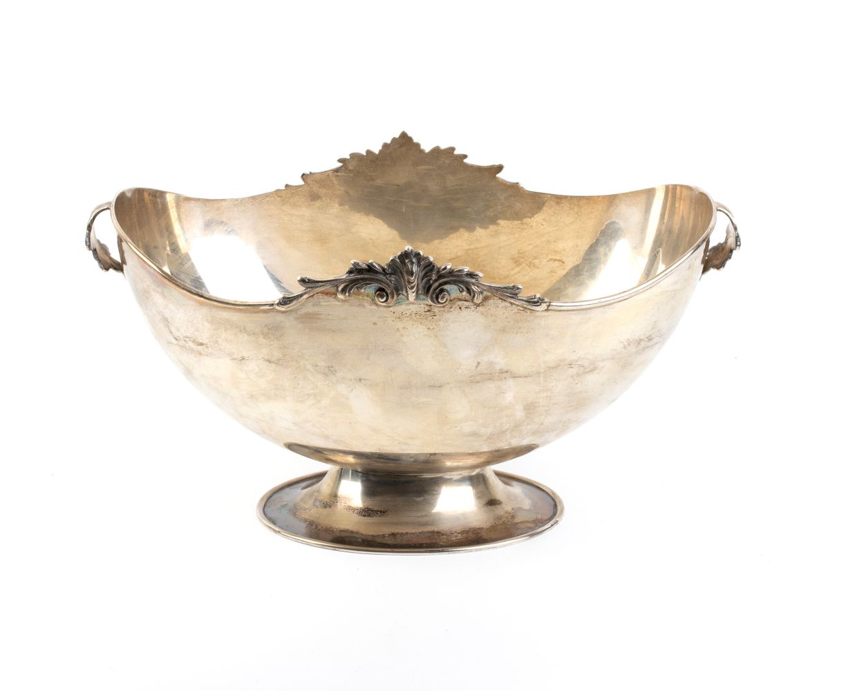 sagomato a casco, su base circolare con bordo a decorazioni vegetali. Argento 800/1000, punzonato "800 - 28 MI", argentiere FABBRICA ITALIANA ARGENTERIE di Alignani Pasquale & Alignani Mariano.