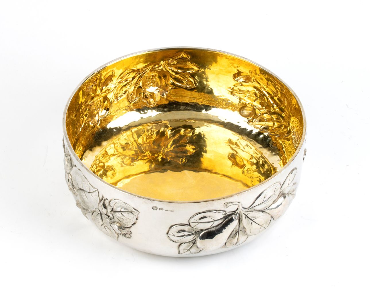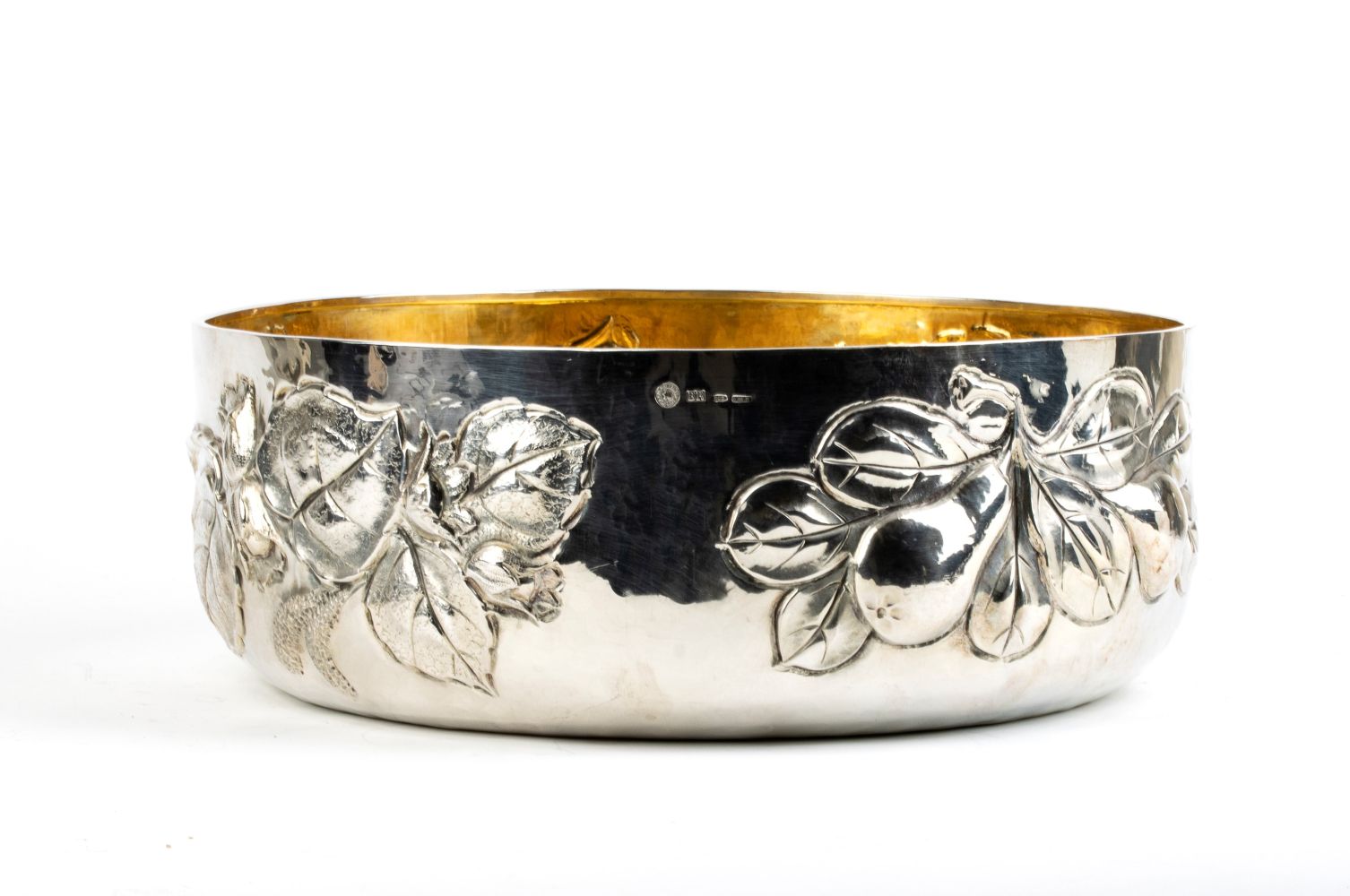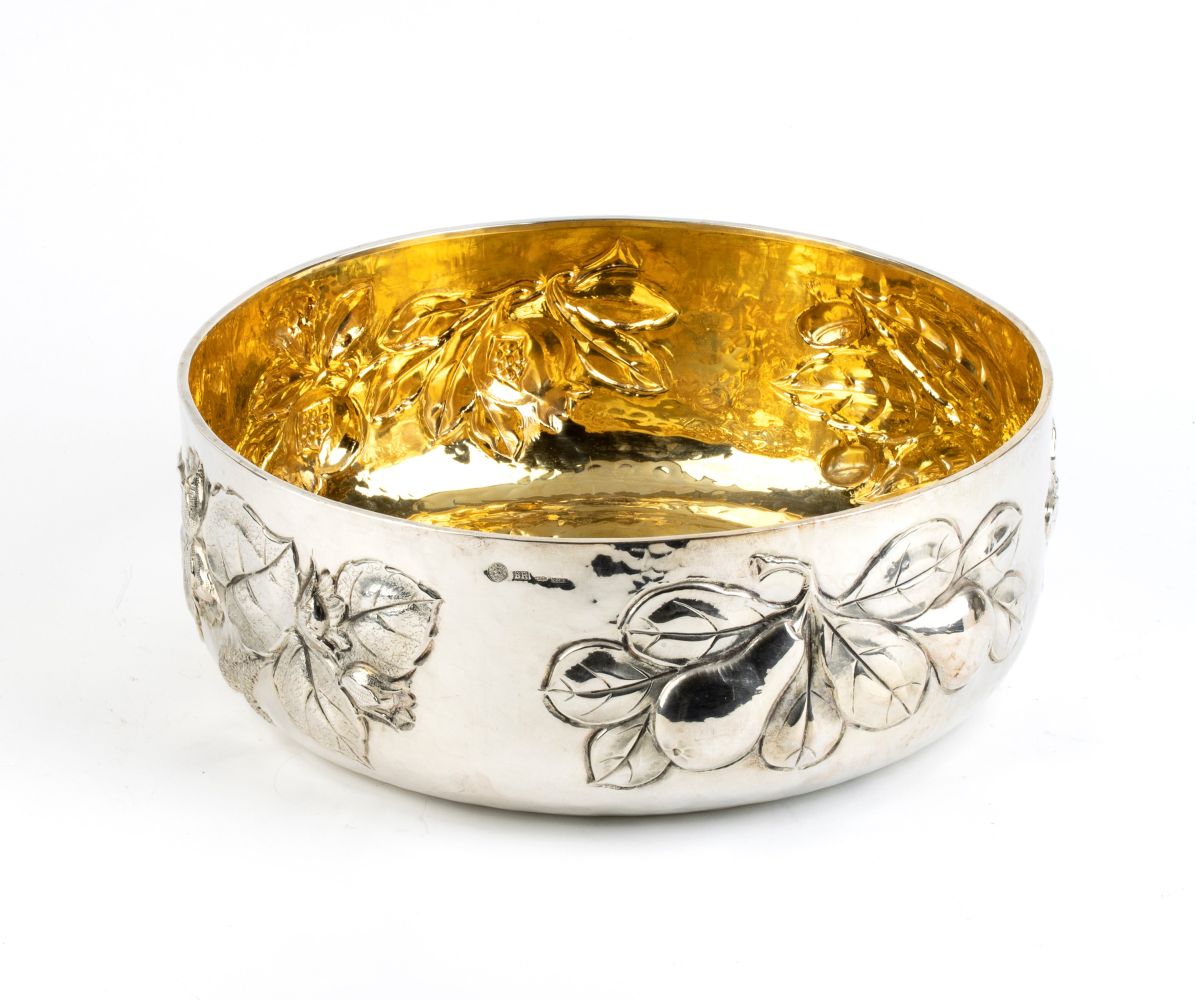 di forma circolare decorata con motivi di frutti e foglie, interno dorato. Argento 800/1000, punzonata "800 - BR - 283 FI", argentiere Brandimarte.