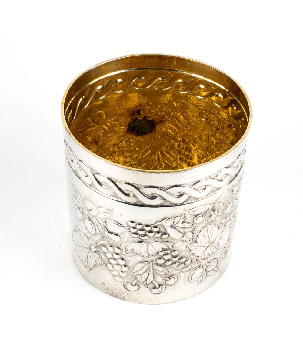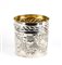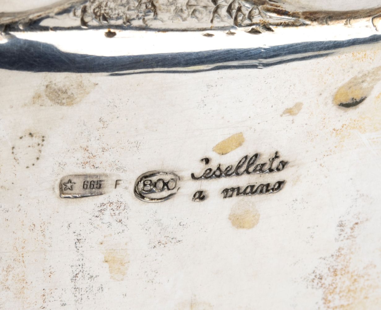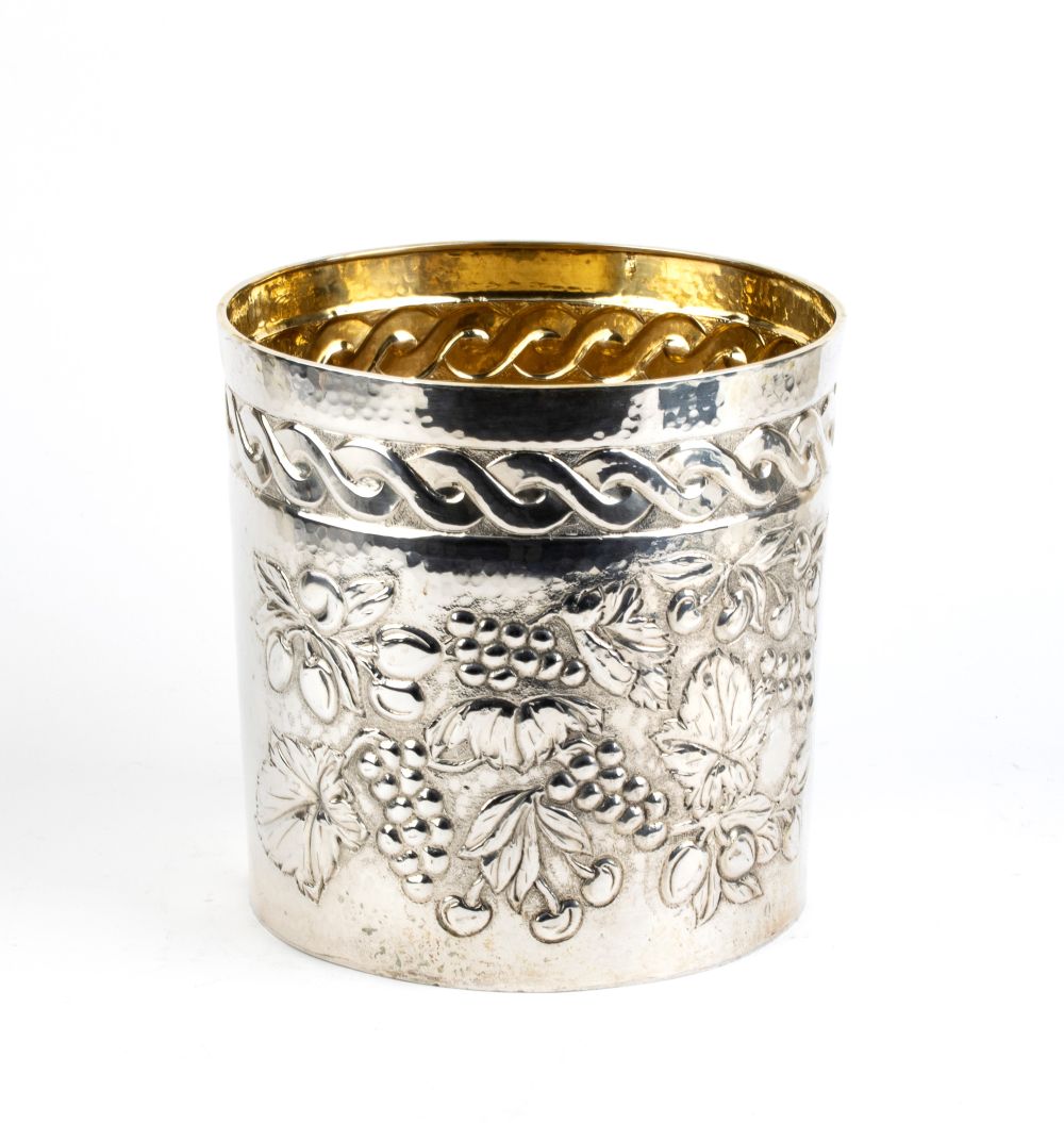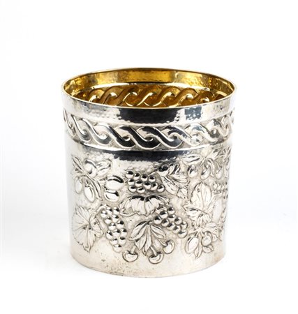 di forma cilindrica con interno dorato, decorato con motivi di fiori, frutti e foglie. Argento 800/1000, punzonato "800 - 665 FI - CESELLATO A MANO", argentiere Brandimarte.